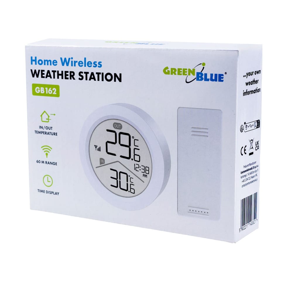 STACJA POGODY Z CZUJNIKIEM BEZPRZEWODOWYM – PRECYZYJNY POMIAR TEMPERATURY I CZASUNowoczesna stacja pogody z bezprzewodowym czujnikiem temperatury GreenBlue GB162 to praktyczne urządzenie do codziennego monitorowania warunków wewnątrz i na zewnątrz pomieszczeń. Dzięki czytelnemu wyświetlaczowi LCD, kompaktowej formie oraz długiej pracy na baterii sprawdzi się zarówno w domu, jak i w biurze czy warsztacie.DOKŁADNY POMIAR TEMPERATURY WEWNĘTRZNEJ I ZEWNĘTRZNEJUrządzenie umożliwia jednoczesne wyświetlanie temperatury wewnętrznej oraz zewnętrznej, co pozwala na bieżąco kontrolować warunki panujące w pomieszczeniu i na zewnątrz budynku. Do pomiaru temperatury zewnętrznej wykorzystywany jest bezprzewodowy czujnik o klasie szczelności IP44, odporny na zachlapania i warunki atmosferyczne.Czujnik komunikuje się ze stacją pogodową na odległość do 60 metrów, co daje dużą swobodę montażu – na balkonie, tarasie, elewacji czy w ogrodzie.