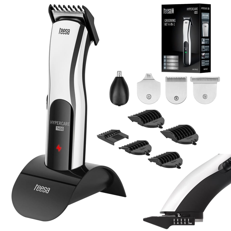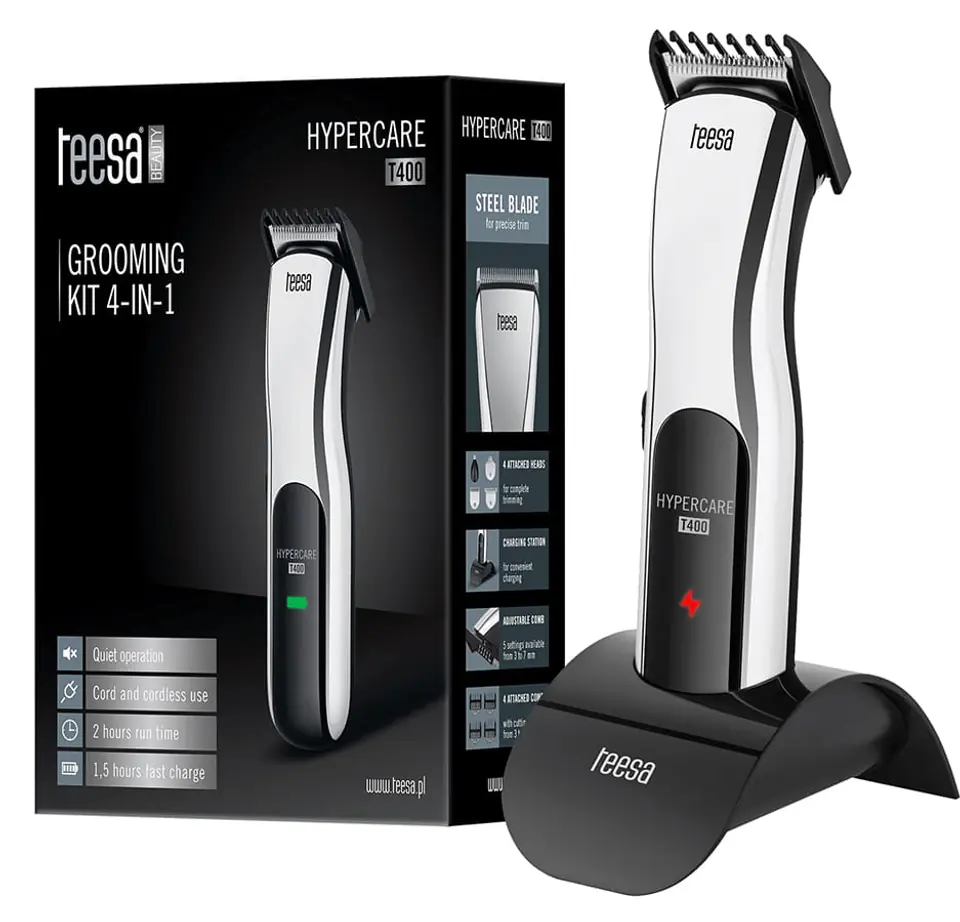 Teesa HYPERCARE T400 jest urządzeniem o zaskakująco szerokim zastosowaniu. W zestawie znalazły się cztery różne głowice, które pozwolą przystrzyc włosy, wystylizować brodę czy usunąć owłosienie z nosa.
