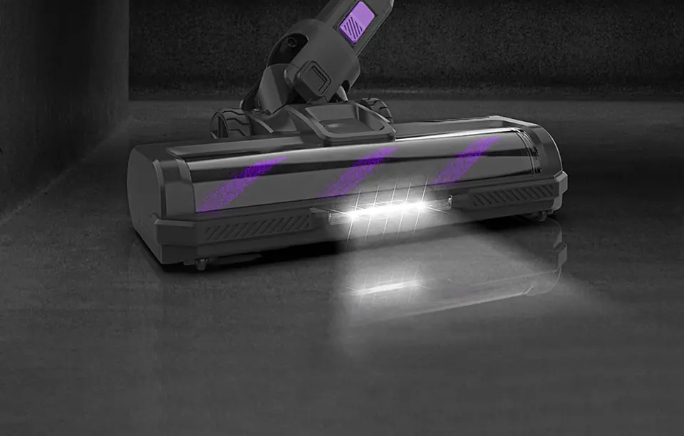 Urządzenie posiada szczotkę z podświetleniem, co pozwala na dokładne czyszczenie przestrzeni pod meblami, gdzie nie dociera światło. Ponadto konstrukcja w kształcie litery V zapobiega wplątywaniu się włosów. Co więcej, wyróżnia się elastycznym designem, dzięki czemu możesz nią wygodnie manewrować – obraca się na boki w zakresie 150°, a do przodu i do tyłu w zakresie 90°.