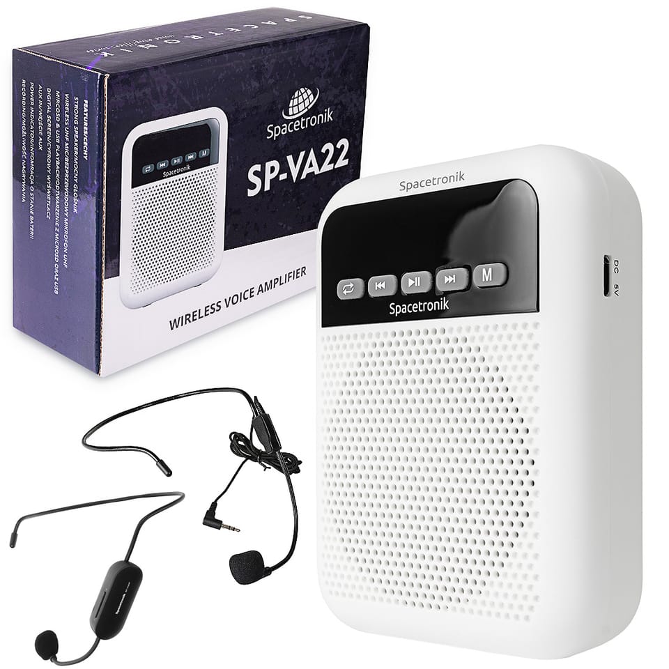 Bezprzewodowy wzmacniacz głosu to urządzenie składające się z mikrofonu, nadajnika i głośnika. Choć zasada działania jest banalnie prosta to liczba możliwości i udogodnień jest duża. Profesjonalny układ wzmacniający zapewnia czysty i wyraźny głos. Dźwięk o mocy 10W pokrywa około 500 metrów kwadratowych, co jest wystarczające, aby nagłośnić salę i zapewnić słyszalność dla grupy 25-100 osób. Wbudowana bateria pozwala na ciągłą pracę do 38 godzin. Model SP-VA22 jest wyposażony w dodatkowy moduł UHF, dzięki czemu może łączyć się bezprzewodowo z dołączonym transmiterem. Urządzenie to doskonałe rozwiązanie dla nauczycieli, przewodników, konferansjerów itp.Najważniejsze zalety wzmacniacza głosu: