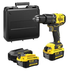 W zestawie dwa akumulatory 18V STANLEY® FATMAX® V20 Cordless System 4.0Ah, ładowarka 2A oraz pudełko z zestawem.