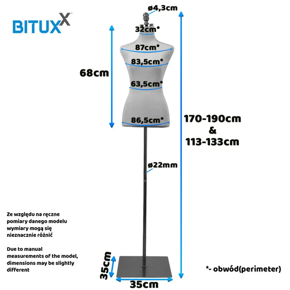 - Wysokość manekina: 68cm- 2 częściowa regulacja wysokości: 113-133cm oraz 170-190cm - Obwód kl. piersiowej 87cm - Obwód talii 63,5cm - Obwód biodra 86,5cm- Wymiary podstawy 35x35cm- Waga ok. 3,6kg- Materiał: styropian, polipropylen, stal Wymiary podane na zdjęciu