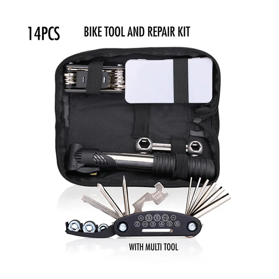 Zestaw narzędzi rowerowych w etui od Bicycle Gear, składający się z 14 elementów, który jest niezbędny przy naprawie każdego roweru i nie tylko. To idealny gadżet dla każdego właściciela dwóch kółek, który doceni jego poręczność i kompaktowość.Nieoceniony towarzysz każdego rowerzysty, ten zestaw narzędzi zapewnia nie tylko niezawodność w naprawach, ale także wygodę użytkowania. Spakowany w niewielkie etui z rzepami, można go łatwo przymocować do ramy roweru, zapewniając szybki dostęp do narzędzi w razie potrzeby.Uniwersalność tego zestawu narzędzi sprawia, że jest niezastąpiony w każdej sytuacji. Niezależnie od tego, czy jesteś na szlaku, w trasie czy w domowym warsztacie, będziesz gotowy do drobnych napraw i regulacji swojego roweru.W skład zestawu wchodzi:1x Mini pompka rowerowa6x Łatka do opon 25 mm2x Plastikowe łyżki do opon rowerowych1x Tarka2x Gumowa rurka zaworu rowerowego1x Klucz 6-15 mm1x Narzędzie wielofunkcyjne: klucz rozmiar 8, 10 i 15 mm, adapter nasadowy z nasadkami 8, 9 i 10 m. Klucz imbusowy 2, 2.5, 3, 4, 5 i 6 mm. Śrubokręt płaski i krzyżakowy.Waga: 550 gWymiar etui: 10 x 6 x 22,5 cm