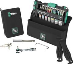 Zestaw narzędzi do naprawy rowerów złożony z grzechotki, bitów, kluczy nasadowych i rękojeści z uchwytem do bitów w niezwykle kompaktowej kasecie Tool-Check. Idealny do różnorodnych zastosowań w każdej sytuacji. A do tego wyjątkowy dodatek: zestaw zawiera dwa etui - jedno etui na kompletny zestaw i małe etui do bezpiecznego przechowywania narzędzi w kieszeni koszuli podczas podróży. Miękkie etui posiada dodatkowe pętle do przechowywania wkładów CO2- (wkłady nie są zawarte w dostawie.