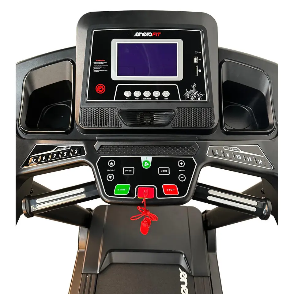 - Wymiar rozłozonej bieżni ok.: 175 x 80,5 x 138 cm (dł. x szer. x wys.)Wymiar złożonej bieżni: 130 x 80,5 x 148 cm (dł. x szer. x wys.)Wymiar ekranu LCD: 16 x 8,7 cm (dł. x wys.)Bieżnia zajmuje około 1,2 m2, wokół urządzenia powinno być co najmniej 2 m wolnej przestrzeniWymiar taśmy: 48 x 132 cm (szer. x dł.)/ listwa 8 cm - szerokośćMaksymalne obciążenie: 150 kgLicznik: puls, czas, prędkość, dystans, kaloriePrzyciski w panelu: Mode, Speed (+/-), start/stopIlość programów: 12 (warm – up, random, sky run, competition, weight –loss, Hill, time goal, distance goal, calories goal, mountain climb, Beach sport, cross contry race)Sprzęt klasy H-C do użytku domowegoWyświetlacz LCD: takPort USB: takPort SD: takGniazdo Jack 3,5 mm: takBluetooth: niePomiar pulsu: tak, czujniki w rączkachAmortyzacja: takUchwyt na bidon: tak, 2 szt.Podstawka na telefon lub tablet: takPas telemetryczny: nieGwarancja: 2 lataInstrukcja w języku polskim: takRolki transportowe: takMożliwość złożenia: takSterowanie wznoszeniem i prędkością z poziomu uchwytów: niePodnośnik hydrauliczny: takMaksymalny czas ciągłej pracy bieżni, to 2 godzinyKlucz bezpieczeństwa: takWentylator: takNapięcie: 220V-240VMoc: 2,5HP/1,83kWAutomatyczna regulacja kąta nachylenia: tak, od 0-15%Regulacja prędkości: tak, quick selekt 4/8/10/12/16Regulacja wznoszenia: tak, quick selekt 3/5/7/9/12 %Prędkość: 1-22 km/hGłośniki: takWaga netto: 62 KGWaga brutto: 77 kgCertyfikat CE: takMarka: ENERO FITModel: W800