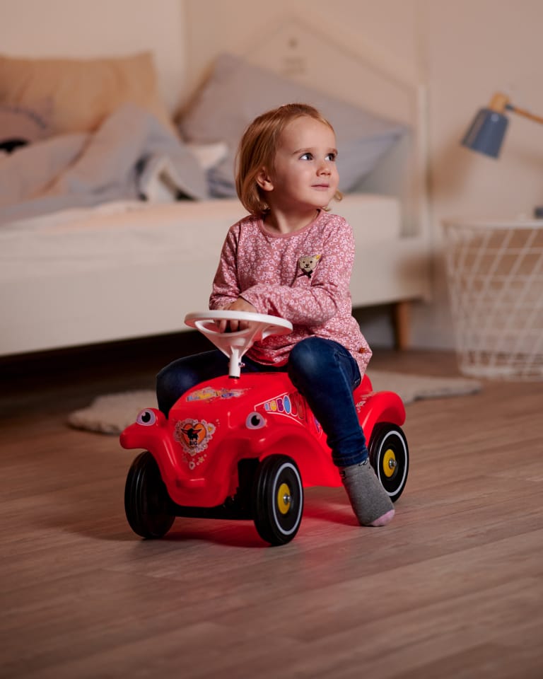 - jeździk został wyposażony w kierownicę z klaksonem,