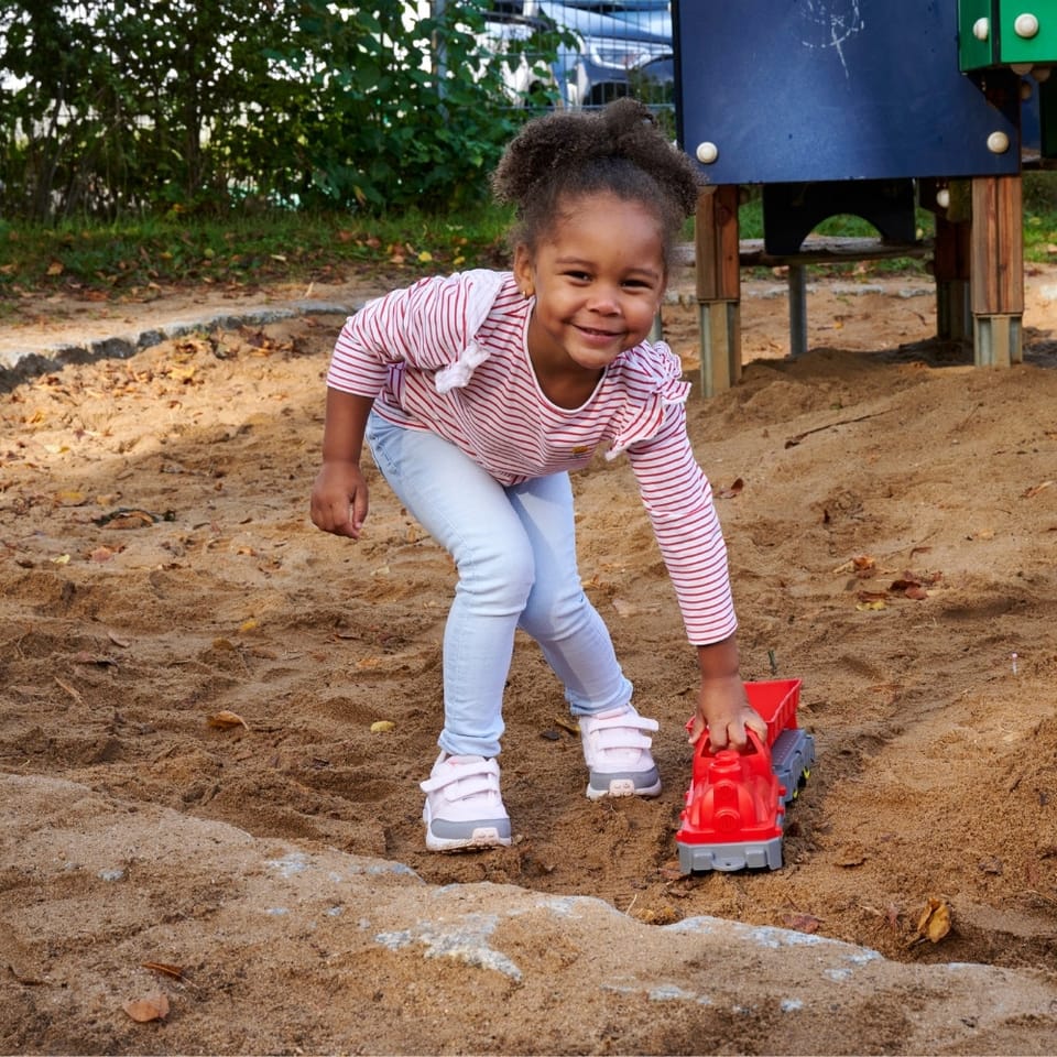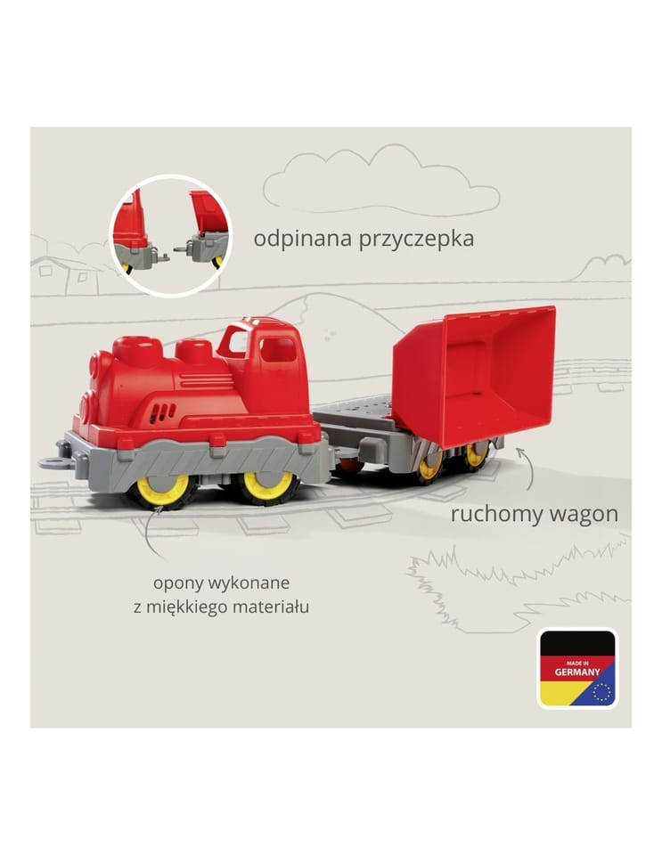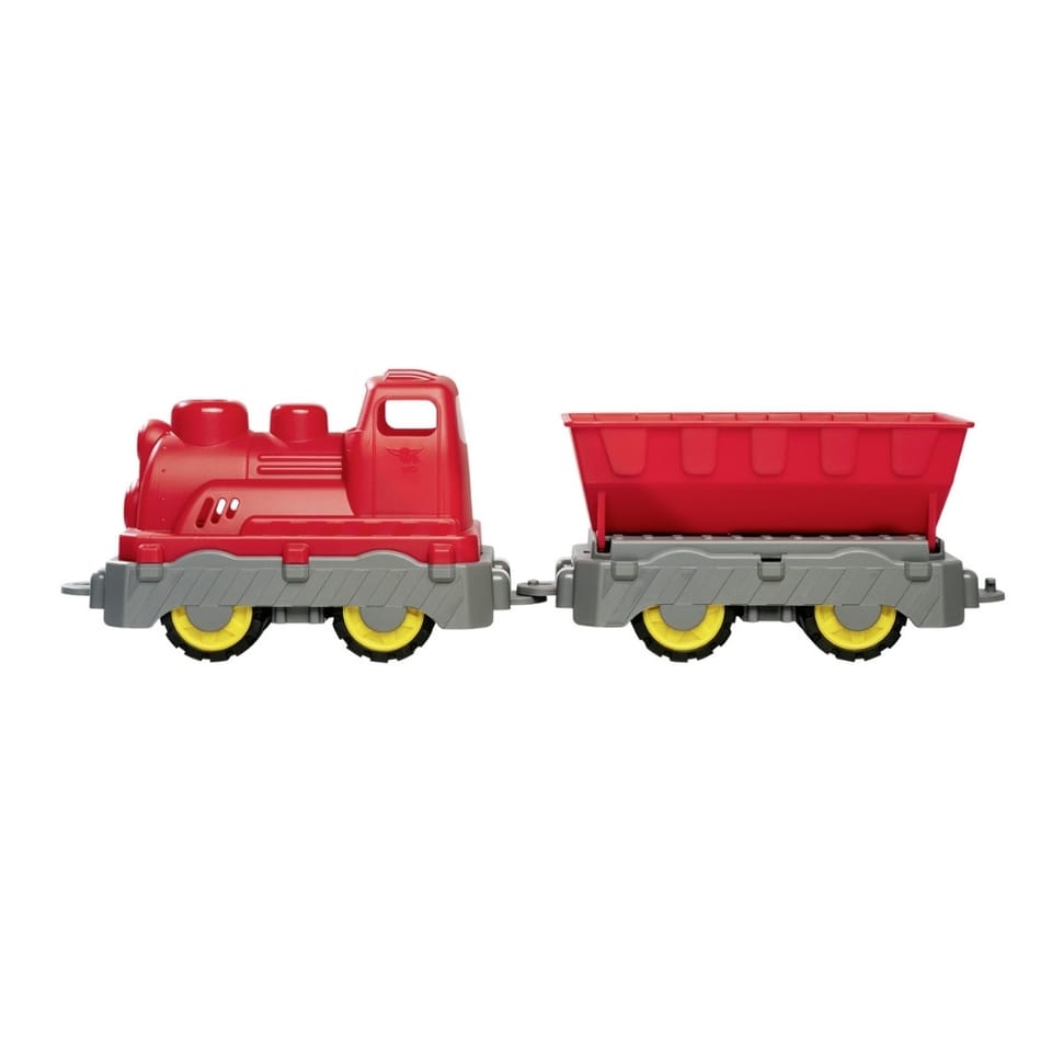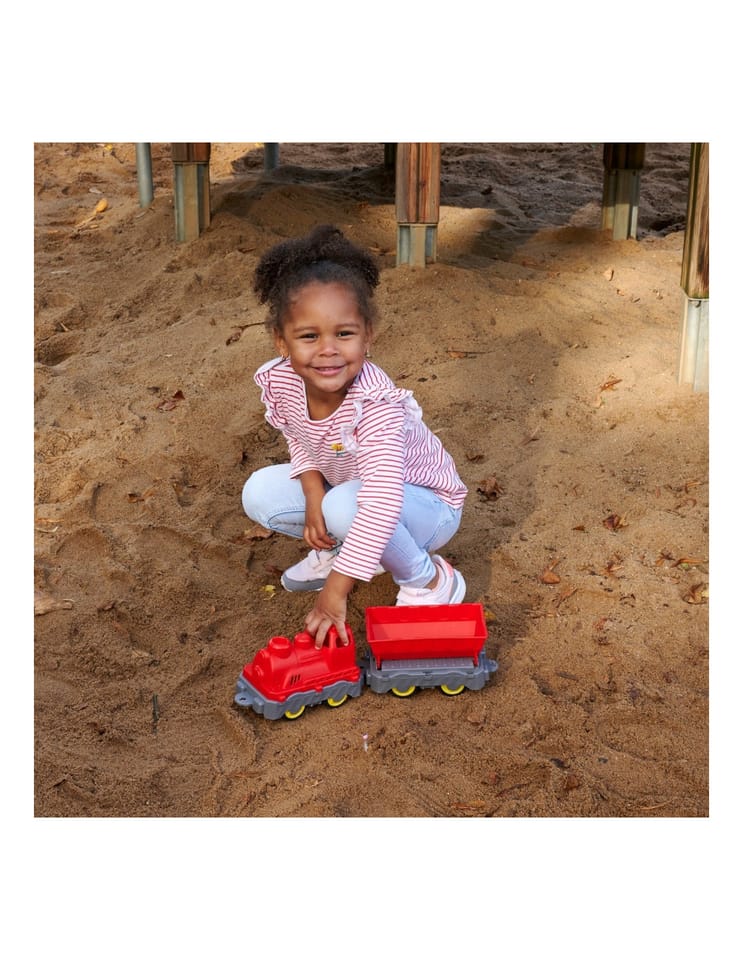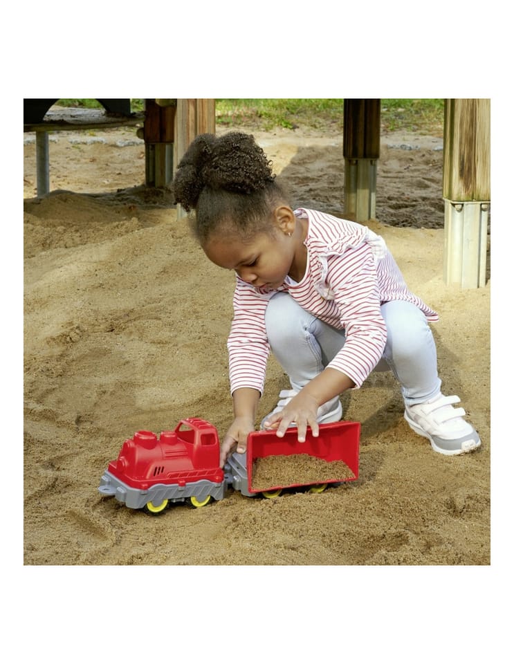 - Idealny do piaskownicy – Odporność na promienie UV i łatwość czyszczenia sprawiają, że pociąg świetnie sprawdzi się również na świeżym powietrzu.