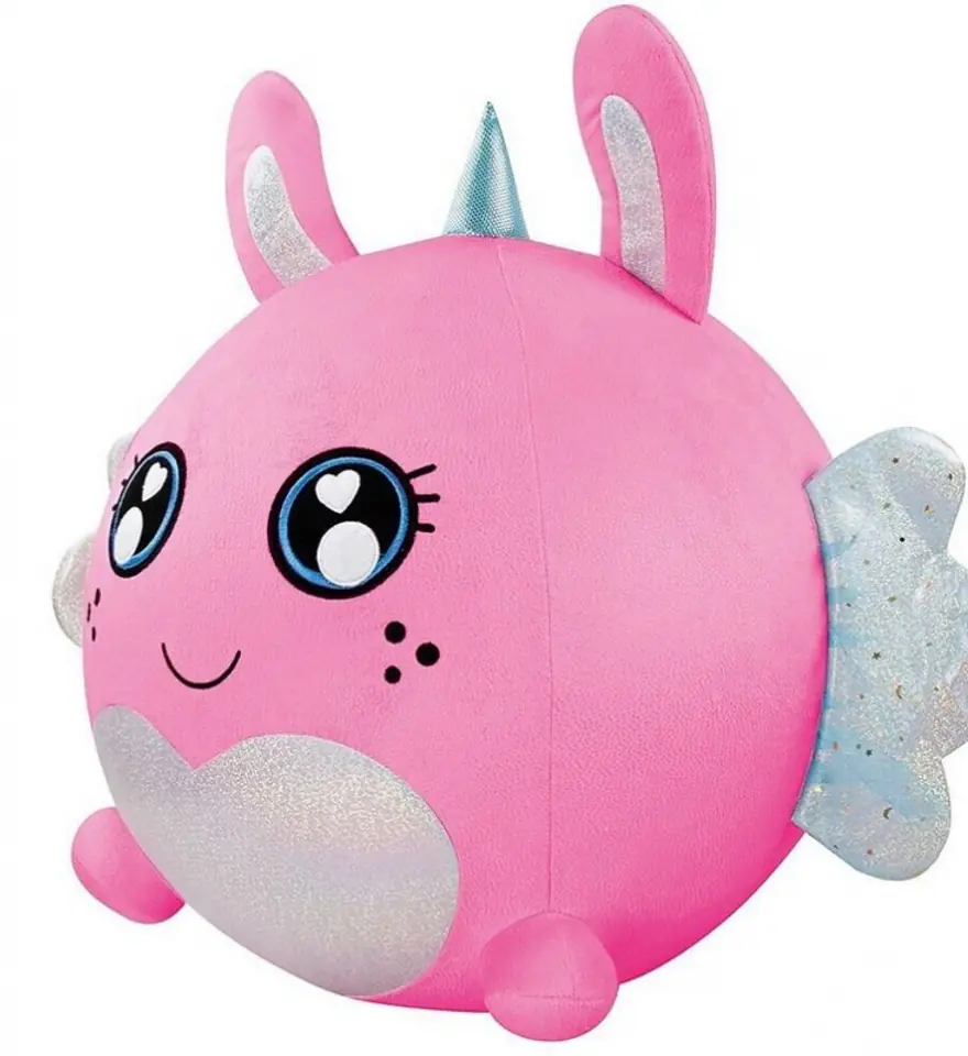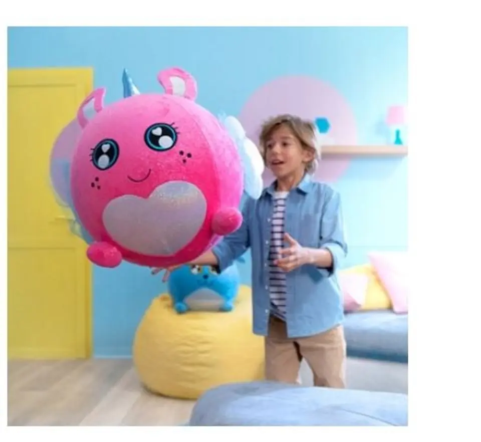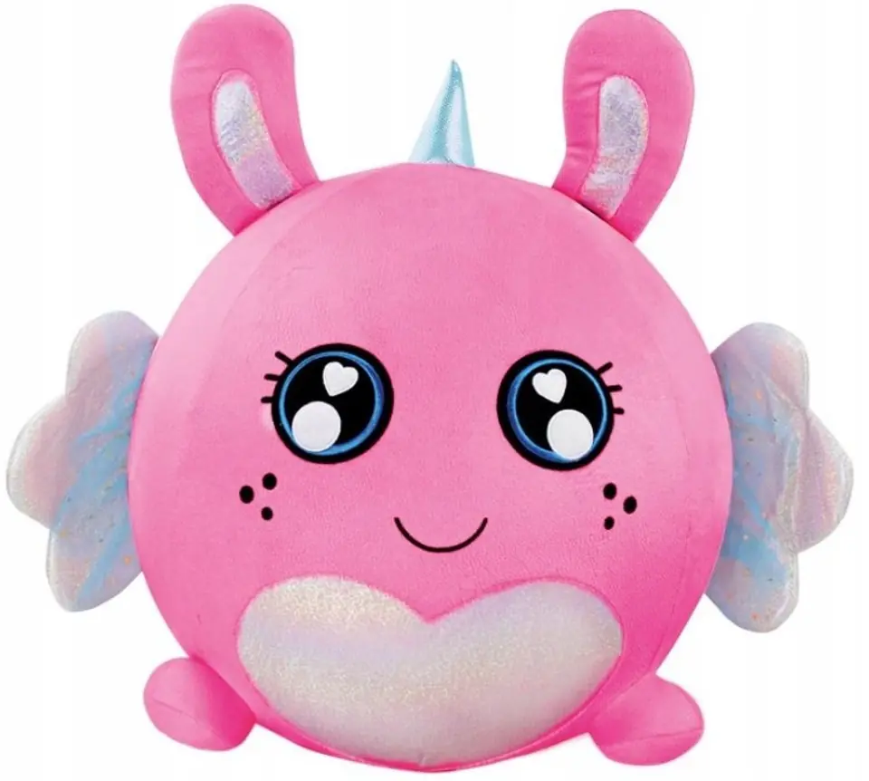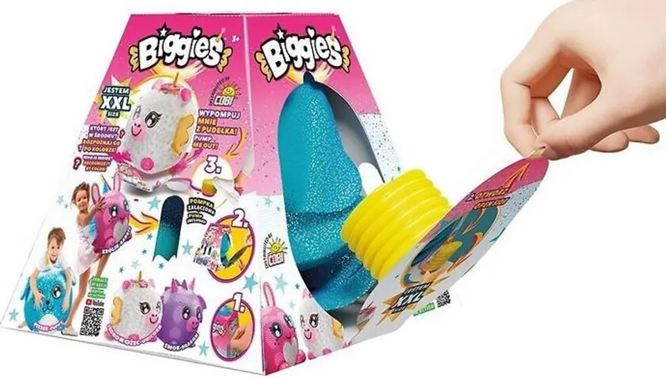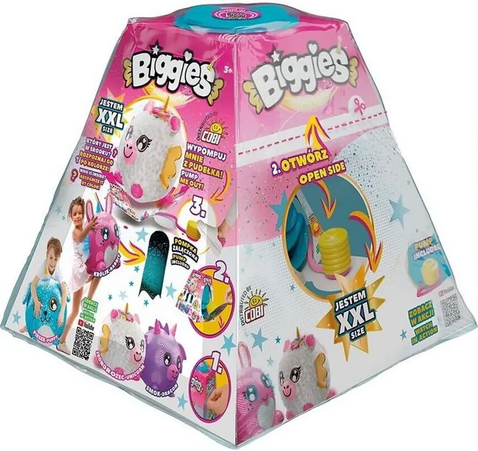 "Biggies! To urocze maskotki - zwierzątka w kształcie piłek w rozmiarze XXL! Innowacja! Wypompujesz je z pudełka! Efekt WOW! Otwórz okienko opakowania, znajdziesz tam pompkę. Gdy zaczniesz pompować, zobaczysz, jak zwierzątko rośnie i rośnie. Staje się takie duże, że bum! WOW! Samo otwiera pudełko! Zwierzatko jest XXL! To rodzinka czterech uroczych pluszowych piłko zwierzątek (w opakowaniu dostępna jest 1 sztuka). W opakowaniu jeden piesek, królik, smok lub jednorożec! Są przepiękne i duże - średnica 45 cm."