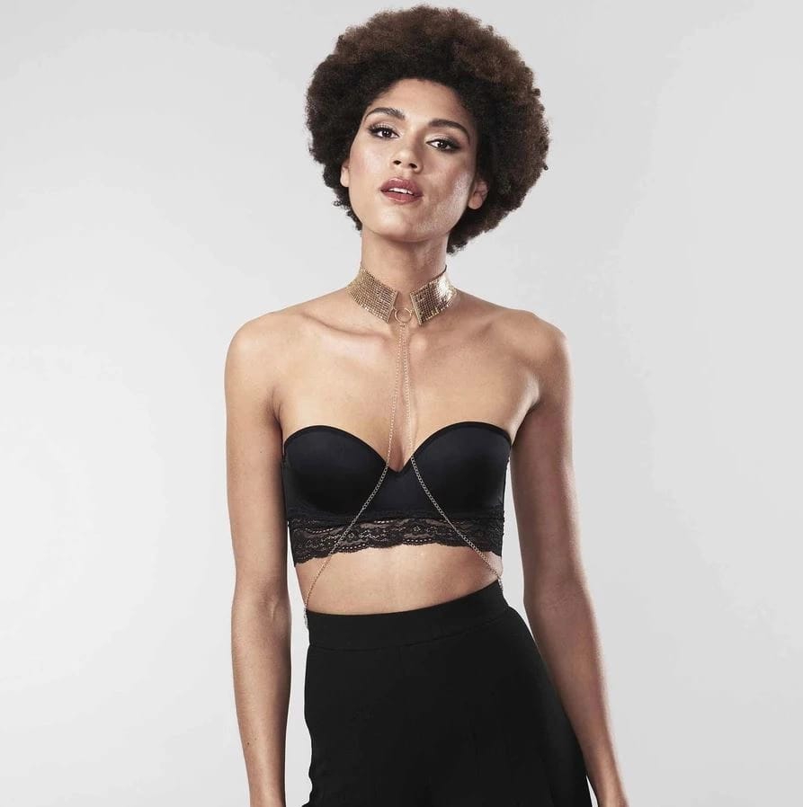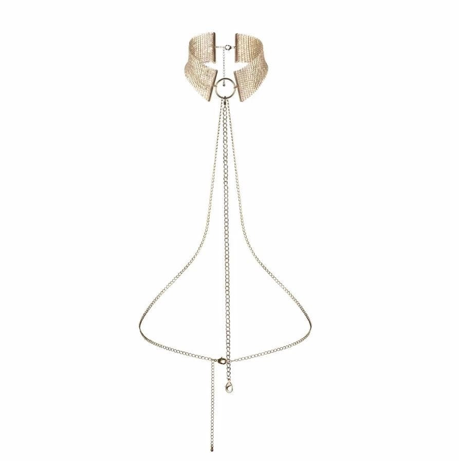Bijoux Indiscrets Desir Metallique Collar Gold – luksusowa obroża w kolorze złota, zaprojektowana z myślą o wyjątkowym wyglądzie oraz komforcie użytkowania. Model ten wyrożnia się eleganckim, metalicznym wykończeniem oraz zestawem delikatnych łańcuszkow, ktore subtelnie opadają na klatkę piersiową, tworząc niepowtarzalny element stylizacji wieczorowej lub na specjalne okazje.