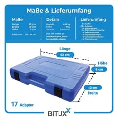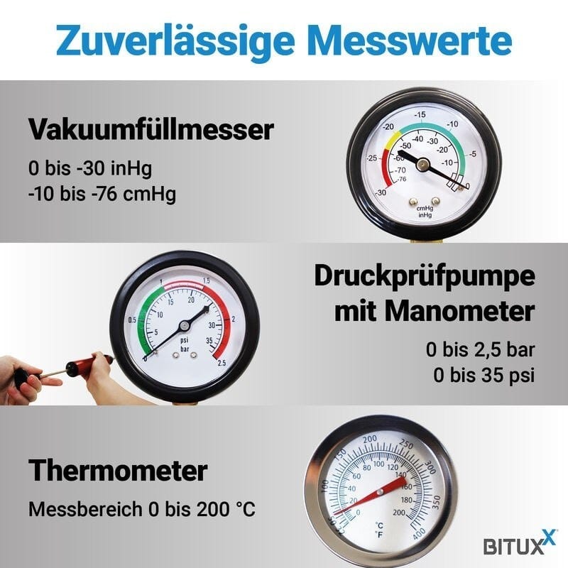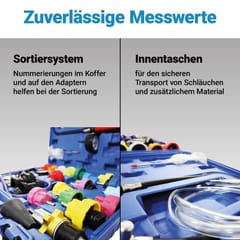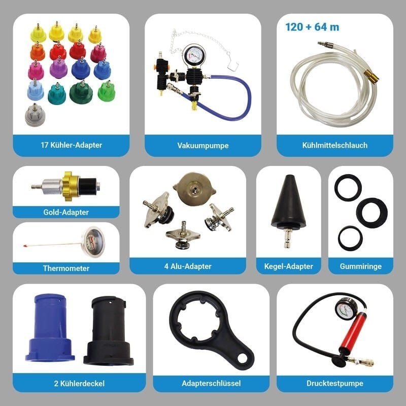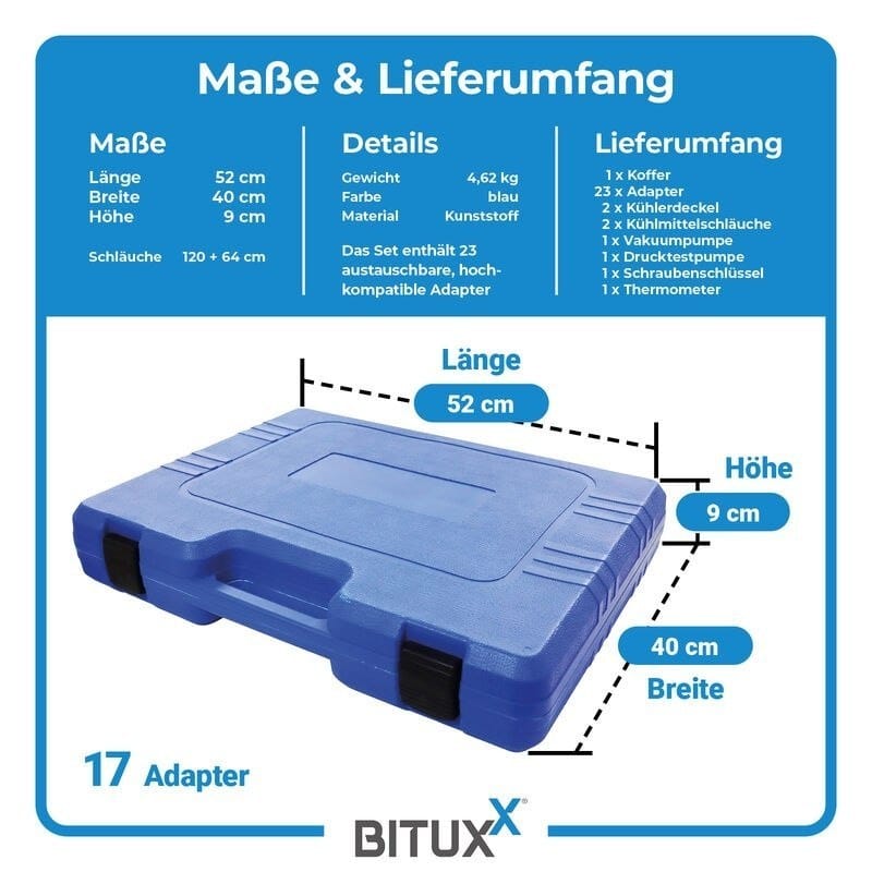Bituxx 34‑częściowy tester układu chłodzenia to profesjonalny zestaw do diagnozy, testowania szczelności, odpowietrzania i napełniania układu chłodzenia w samochodach. Zestaw pozwala łatwo sprawdzić, czy układ chłodzenia jest szczelny – wykrywając nieszczelności w chłodnicy, przewodach, korku chłodnicy, zbiorniku wyrównawczym, nagrzewnicy czy przewodach — a także szybko i czysto uzupełnić płyn chłodniczy.