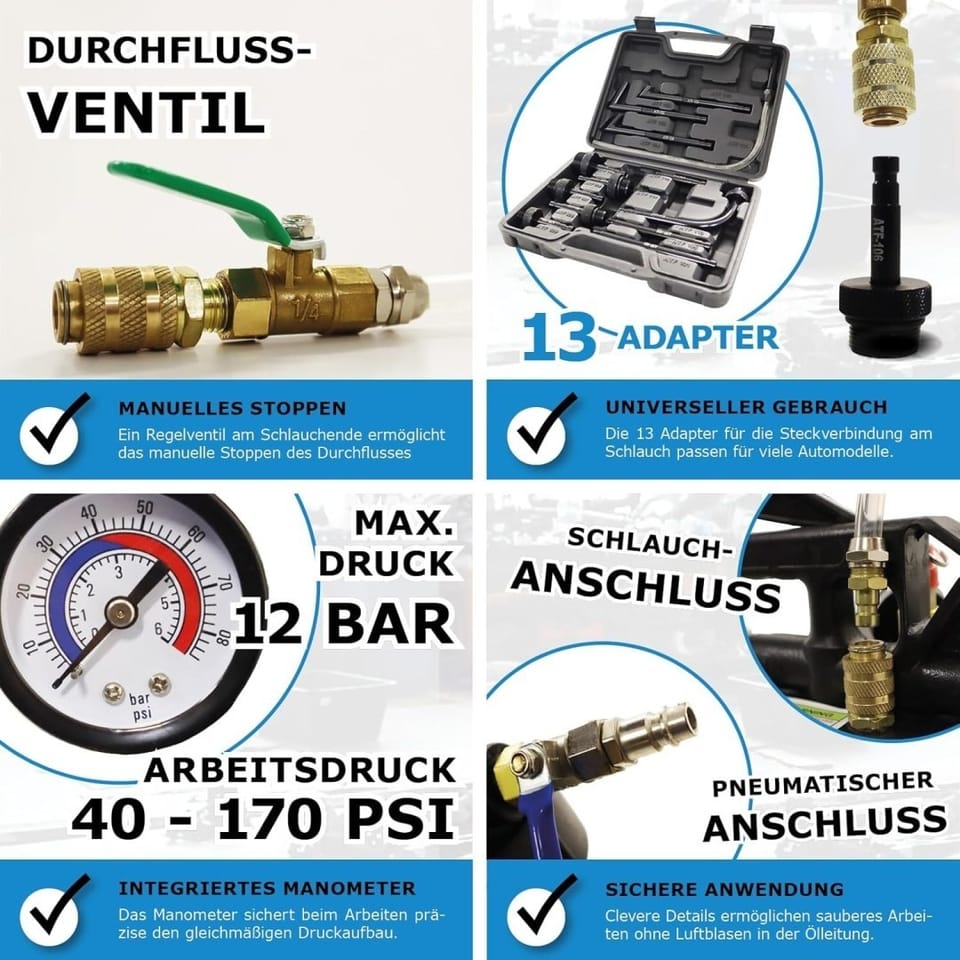 Produkt wykorzystuje napęd pneumatyczny (powietrzny), dzięki czemu olej jest wprowadzany do układu pod ciśnieniem bez konieczności ręcznego pompowania. Taka konstrukcja zapewnia komfortową i mniej męczącą obsługę. Wiele podobnych pomp pneumaticznych oferuje także adaptery pasujące do szerokiej gamy samochodów, umożliwiając dopasowanie do różnych typów skrzyń biegów i pojazdów.