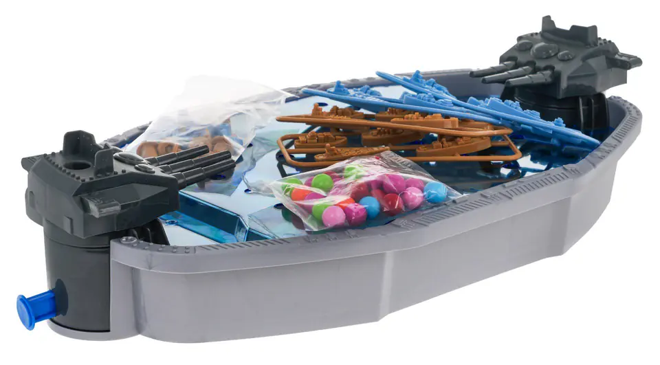 - okręt z wyrzutniami, - 10 x statek niebieski, - 10 x statek brązowy, - 30 x różnokolorowe piłeczki- pociski