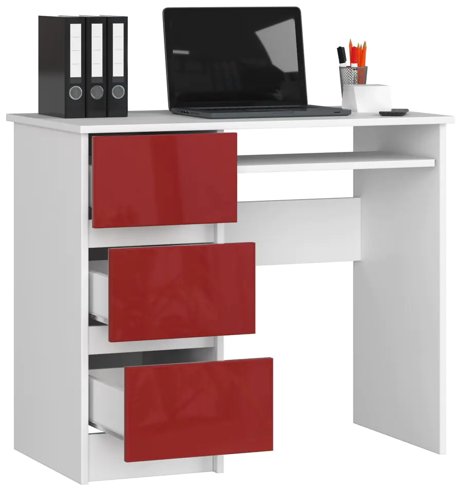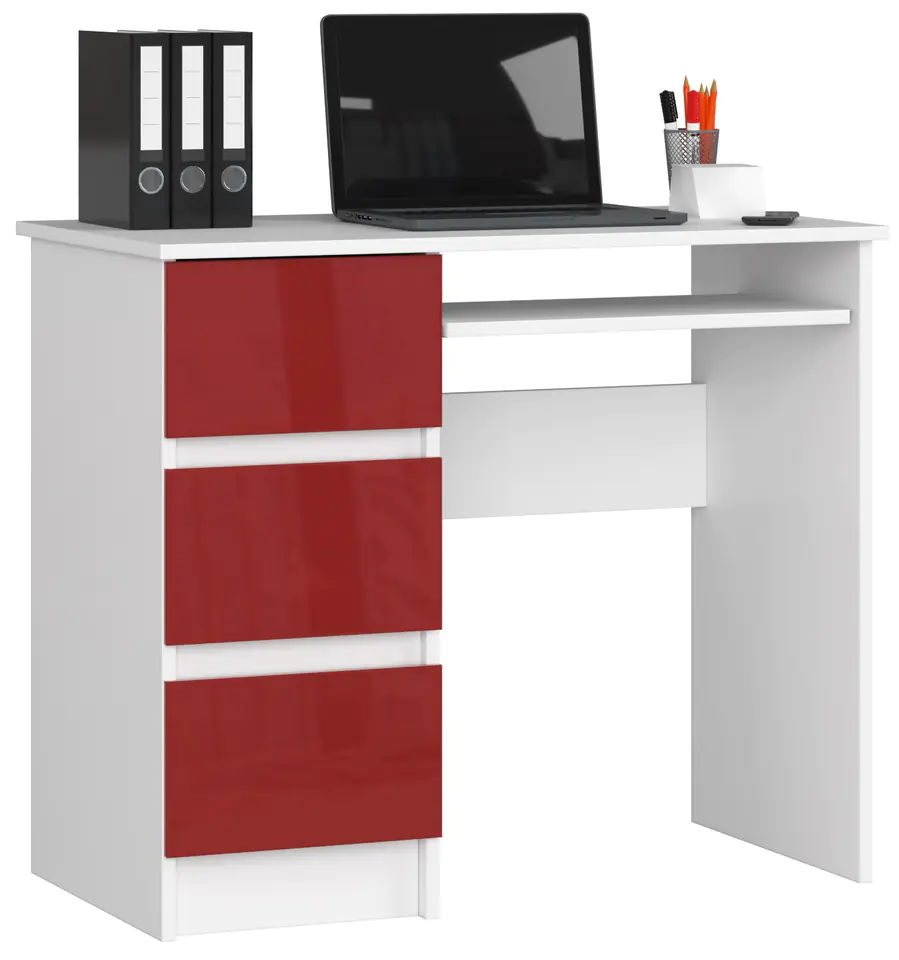 Biurko komputerowe A-6 stworzone dla osób ceniących sobie zarówno komfort i wygodę, jak i zadowalający efekt wizualny. Wykonane zostało z wysokiej jakości materiałów i specjalnie przystosowane do pracy z laptopem lub komputerem. Białe biurko połączone zostało z czerwonymi frontami szuflad o połyskującym wykończeniu. Delikatny kontrast kolorystyczny sprawdzi się idealnie dla miłośników nietypowych i tych bardziej odważnych wnętrz.