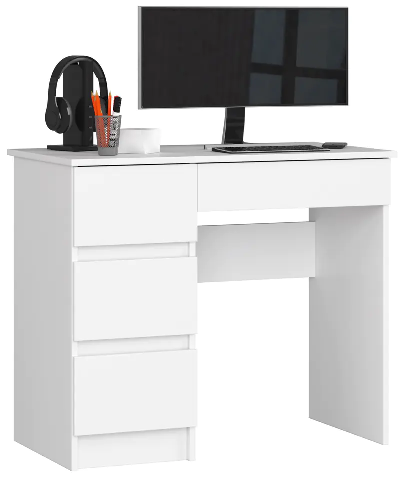Biurko wyposażone zostało w cztery praktyczne szuflady, które sprawnie i cicho poruszają się na metalowych prowadnicach kulkowych, dzięki czemu bardzo łatwo się je otwiera i zamyka. Fronty szuflad prezentują się elegancko, ponieważ także zostały wykonane z płyty laminowanej w białym kolorze. Umieszczone zostały one po lewej stronie, co jest praktycznym i funkcjonalnym rozwiązaniem.Szuflady te zapewniają dużą ilość przestrzeni do zagospodarowania, natomiast na blacie o długości 90 cm oraz szerokości 50 cm, z łatwością zmieści się laptop lub monitor komputera stacjonarnego, przybory do pisania oraz inne potrzebne do nauki przedmioty. Wysokość 77 cm pozwoli na wygodną naukę, zarówno dzieciom z młodszych, jak i starszych klas. Dzięki swoim wymiarom biurko jest także ustawne i zmieści się nawet w mniejszych pokojach.