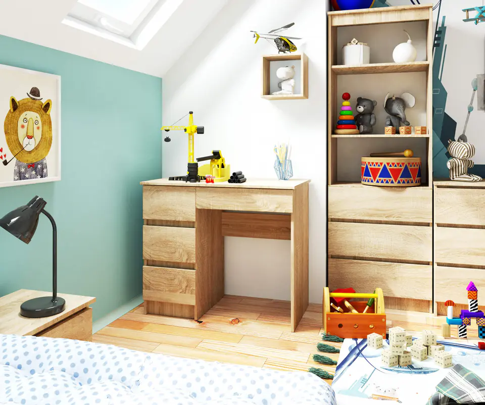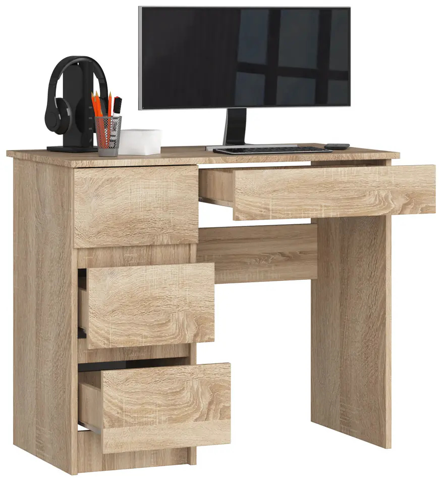 Biurko komputerowe lewostronne w kolorze dąb sonoma z czterema pojemnymi szufladami. Idealnie nadaje się do pokoju dziecka, młodzieżowego, a nawet do pomieszczenia biurowego czy pracowni. Biurko należy do systemu mebli CLP, jest zaprojektowane z myślą o dopasowaniu do pozostałych mebli z tej serii. Dzięki temu możesz skompletować wyposażenie pokoju w różne meble, np. regały czy komody, które będą do siebie pasować kształtem i kolorem. Posiada nowoczesną linię, bezuchwytowe szuflady nadają meblom minimalistycznego uroku. Otrzymujesz dużo miejsca do przechowywania, posiadając aż cztery szuflady. Dzięki klasycznemu wyglądowi biurko ma uniwersalny charakter i nigdy nie wyjdzie z mody. Konstrukcja biurka umożliwia wygodne oraz ergonomiczne korzystanie z komputera.