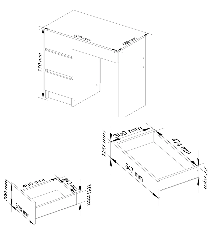 Biurko ma 90cm długości, 77cm wysokości i 50cm głębokości. Zbudowane z płyty laminowanej o grubości 16mm, która ma wysoką odporność na ścieranie. Dodatkowo posiada półkę pod klawiaturę, która podobnie jak szuflady porusza się na metalowych prowadnicach rolkowych. Gwarantuje to płynny ruch wysuwania, w razie potrzeby z powodzeniem można wyjąć szufladę. Krawędzie biurka zostały pokryte obrzeżem ABS, ma ono za zadanie chronić przed uszkodzeniami mechanicznymi i innymi zarysowaniami.