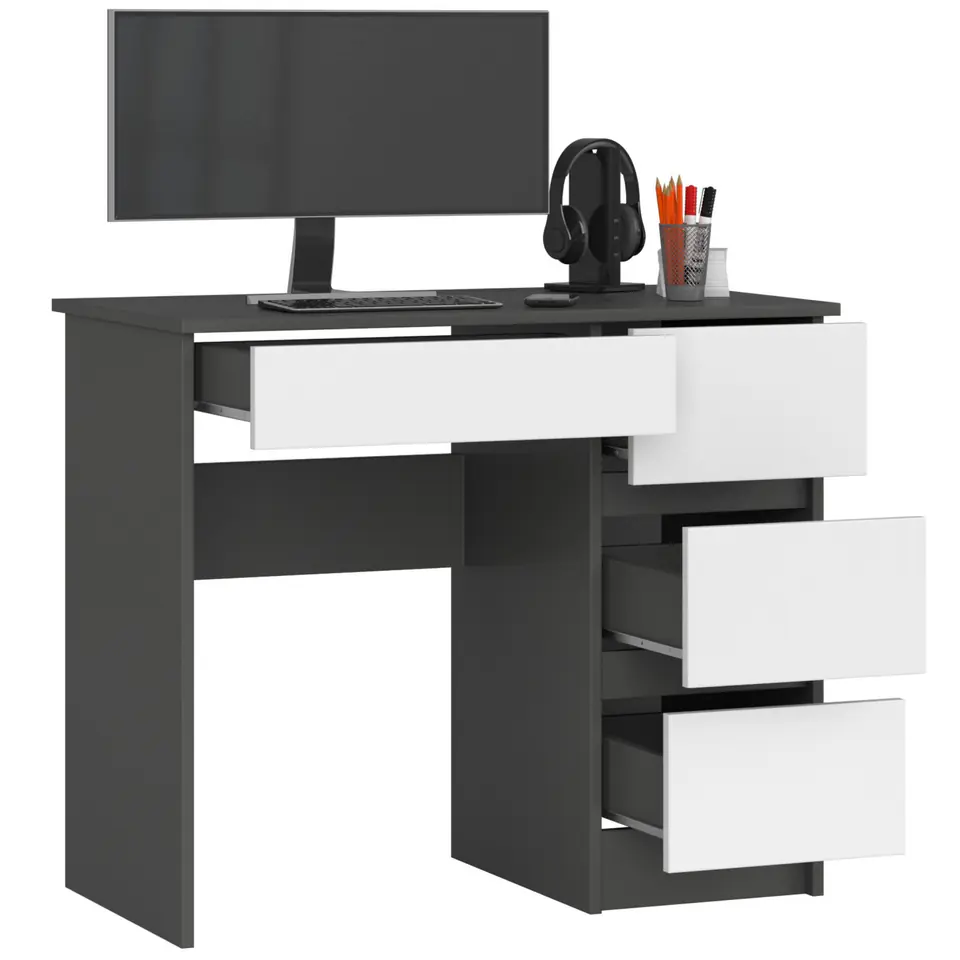 Biurko komputerowe A-7 to niewielkich rozmiarów mebel, który znajdzie zastosowanie w małym pomieszczeniu - biurowym lub mieszkalnym. Sprawdzi się na przykład w domowym gabinecie lub pokoju dziecięcym/młodzieżowym. Prezentowany produkt łączy w sobie dwa kontrastujące, ale świetnie uzupełniające się kolory grafit szary oraz biel. Składa się z trzech szuflad przeznaczonych do dowolnego zagospodarowania. Prosty w swej formie, jednak niezwykle funkcjonalny mebel z pewnością zostanie doceniony przez osoby, które pragną stworzyć kącik do pracy lub nauki, jednak nie mają do dyspozycji wiele miejsca.