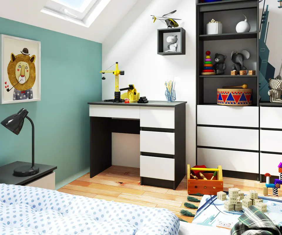 Do biurka można dopasować inne elementy wyposażenia, takie jak regał, szafa czy biurko, dzięki którym będzie możliwe stworzenie funkcjonalnego, ponadczasowego pokoju dziecięcego, młodzieżowego lub domowego gabinetu. Meble pochodzące z kolekcji łączą w sobie solidną konstrukcję, uniwersalny design, wykonanie z dbałością o szczegóły oraz łatwość codziennego użytkowania.