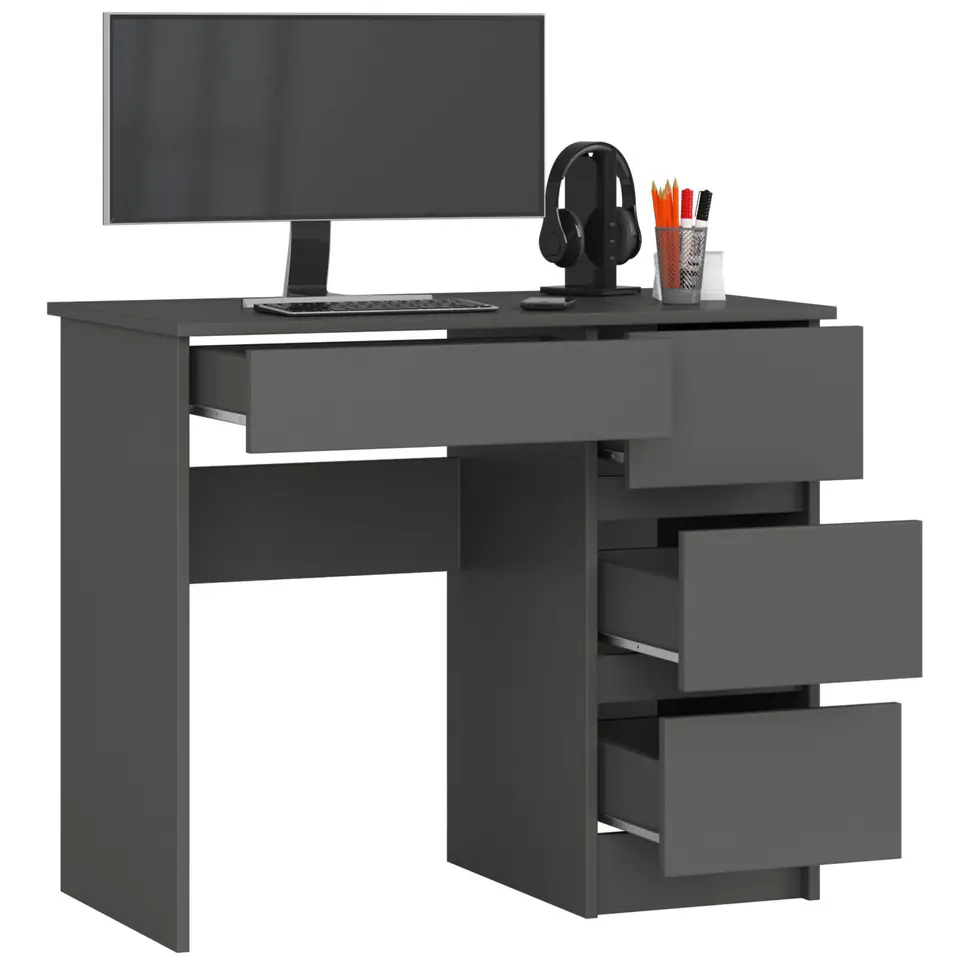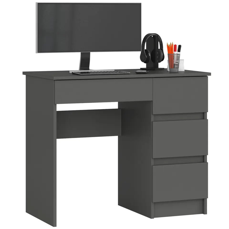 Biurko komputerowe A-7 to niewielkich rozmiarów mebel, który znajdzie zastosowanie w małym pomieszczeniu - biurowym lub mieszkalnym. Sprawdzi się na przykład w domowym gabinecie lub pokoju dziecięcym/młodzieżowym. Prezentowany produkt występuje w całości w kolorze grafit szary. Składa się z trzech szuflad przeznaczonych do dowolnego zagospodarowania. Prosty w swej formie, jednak niezwykle funkcjonalny mebel z pewnością zostanie doceniony przez osoby, które pragną stworzyć kącik do pracy lub nauki, jednak nie mają do dyspozycji wiele miejsca.