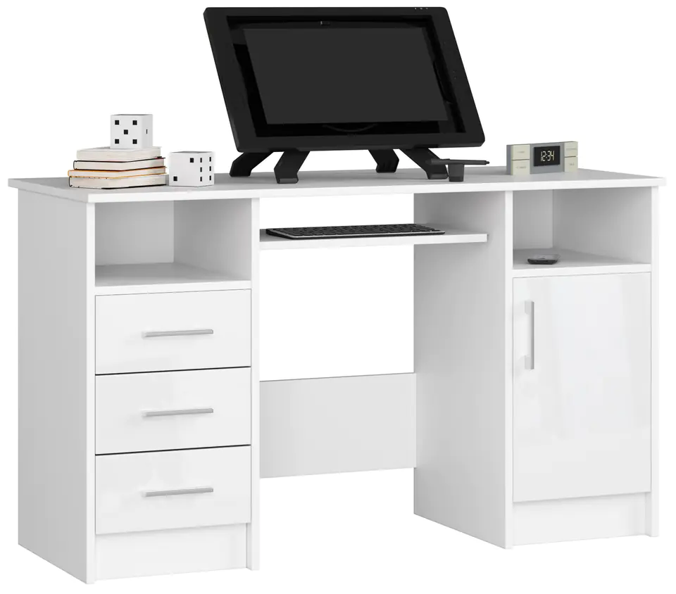 Prezentowane biurko wyróżnia się prostą formą i eleganckim wyglądem - w sam raz dla osób ceniących sobie funkcjonalne i estetyczne rozwiązania. Mebel został wykonany z wysokogatunkowej płyty laminowanej 16mm, która cechuje się dużą odpornością na ścieranie. Z kolei jej krawędzie zostały obklejone obrzeżem ABS, dzięki czemu niełatwo ulegają uszkodzeniom. Co ciekawe, fronty szuflad i drzwiczek wykonane zostały z płyty MDF akryl wysoki połysk - charakteryzuje się ona najwyższym możliwym standardem połysku. Mebel jest białego koloru i posiada srebrne uchwyty. Biurko zawiera trzy szuflady, dwie otwarte półki i jedną półkę z drzwiczkami, dając tym samym wiele przestrzeni do zagospodarowania. Pozwala to na dobrą organizację pracy, gdyż w zasięgu ręki umieścić można ważne akcesoria i urządzenia. Wymiary biurka to 124 cm długości, 74 cm wysokości i 52 cm długości. Mebel przeznaczony jest do samodzielnego montażu. Pomaga w tym dołączona do zamówienia instrukcja. Biurko świetnie sprawdzi się w miejscu pracy i w domu.