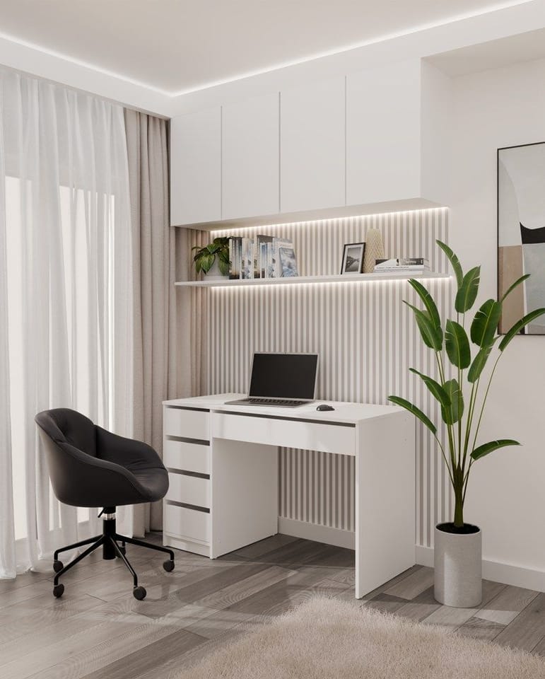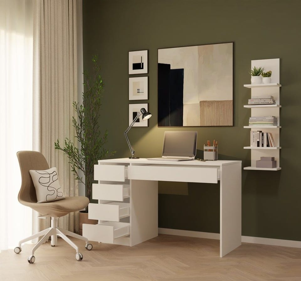 Boczne szuflady pomagają uporządkować drobiazgi i dokumenty, a szeroka szuflada pod blatem to świetne miejsce na rzeczy, które chcesz mieć zawsze pod ręką – ale nie na widoku. Efekt? Czysty blat i pełna koncentracja.