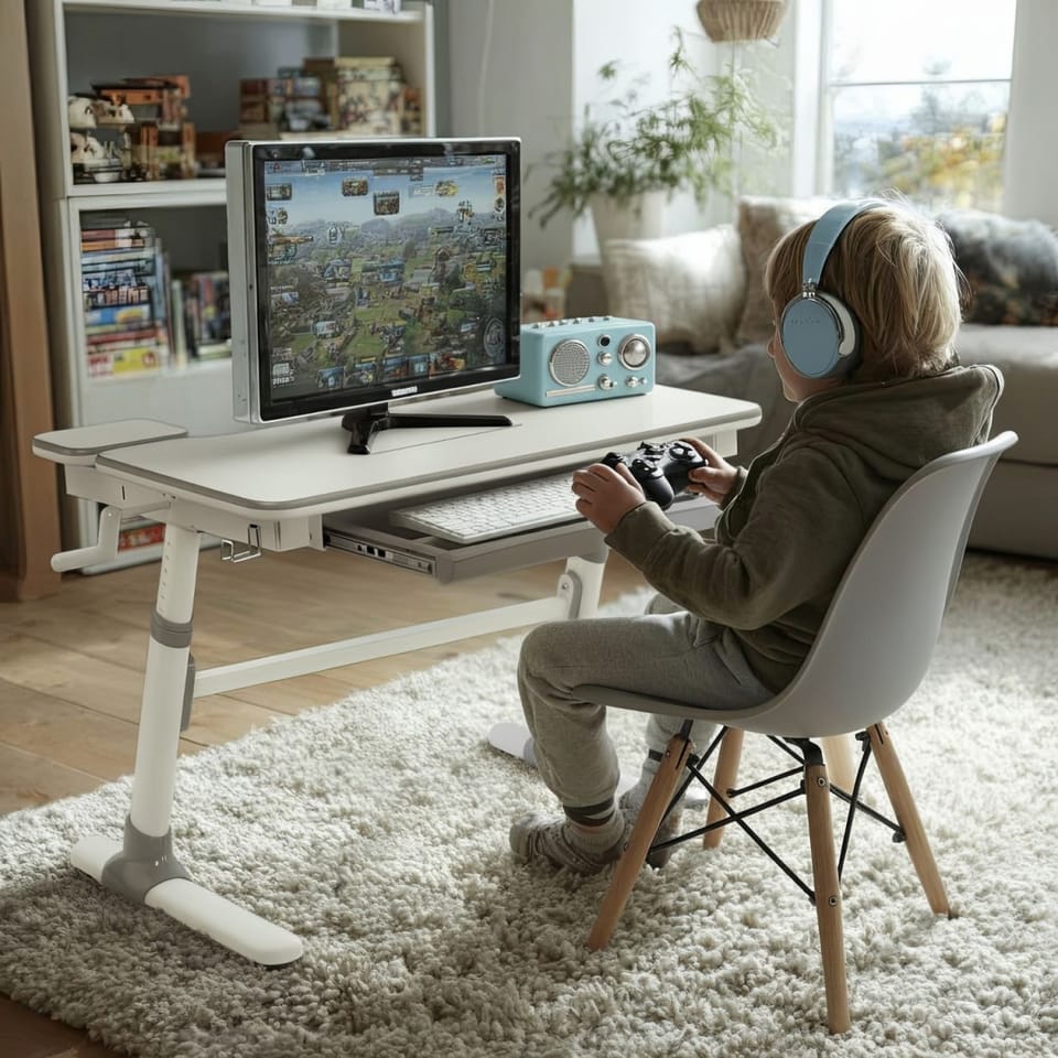 Ergonomiczne biurko z regulacją wysokości umożliwiającą dostosowanie do wzrostu dziecka.
