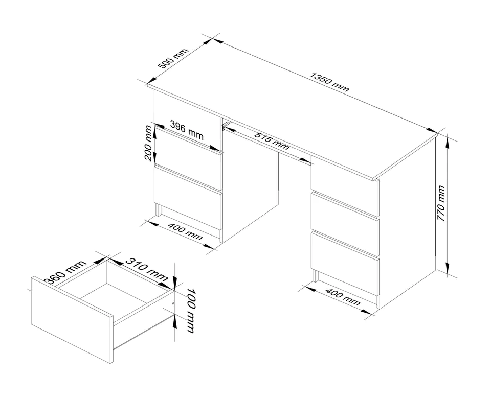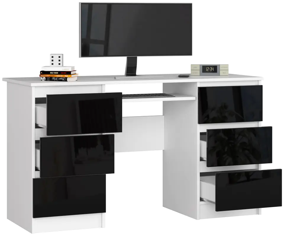 BIURKO KOMPUTEROWE A-11 135 cm 6 SZUFLAD PK BIAŁE / CZARNY POŁYSK