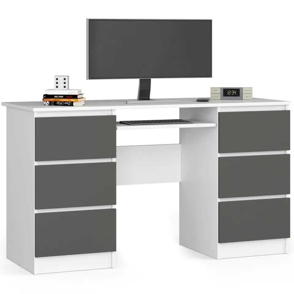 Niezależnie czy pracujesz w biurze, czy zdalnie, spędzasz przy biurku co najmniej kilka godzin dziennie. Doskonale zdajesz sobie więc sprawę, że od wyboru tego mebla w dużej mierze zależy komfort Twojej pracy. W tej roli doskonale sprawdzi się biurko komputerowe A-11. Posiada aż 6 pojemnych szuflad o głębokości 34,5 cm, w których bez problemu zmieścisz wszystkie dokumenty oraz sprzęt. Biurko posiada także wysuwaną półkę, na której wygodnie postawisz klawiaturę lub schowasz najpilniejsze notatki. Klasyczne połączenie bieli oraz grafitu szarego będzie świetnie pasować do prostych, eleganckich biur.