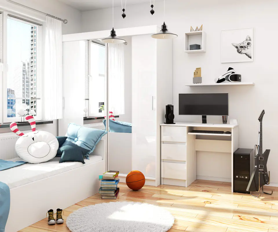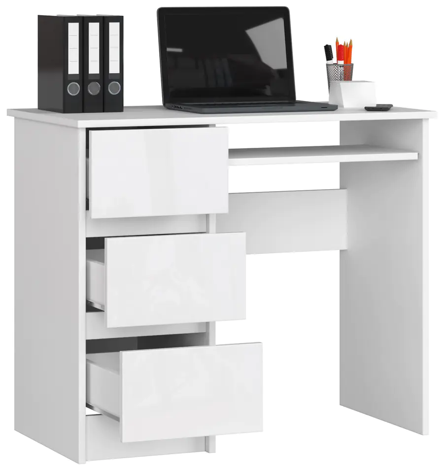 Niewielkie białe biurko to ciekawa propozycja stworzona z myślą o osobach preferujących styl skandynawski, ceniących sobie prostotę i elegancję w najlepszym wydaniu. Klasycznie piękny mebel zaprojektowany w modnym kolorze białym na pewno zadowoli osoby poszukujące niewielkich rozmiarów biurka do pokoju dziecięcego, młodzieżowego lub domowego gabinetu. Ponadto produkt dobrze będzie prezentował się w firmowym biurze. Na mebel składa się blat o szerokości 90 centymetrów, trzy pakowne szuflady oraz wysuwana półeczka pod klawiaturę. Biurko powstało z płyty laminowanej o grubości 16 milimetrów, która wykazuje dużą odporność na zarysowania, cechuje się wytrzymałością i pięknie prezentuje się w każdym pomieszczeniu. Produkt objęty dwuletnią gwarancją na pewno sprosta oczekiwaniom nawet najbardziej wymagających klientów odwiedzających nasz sklep internetowy. Gwarantujemy korzystne ceny oraz szereg rozwiązań, które pomogą w urządzeniu nowoczesnej i funkcjonalnej przestrzeni biurowej w Państwa domu lub firmie.