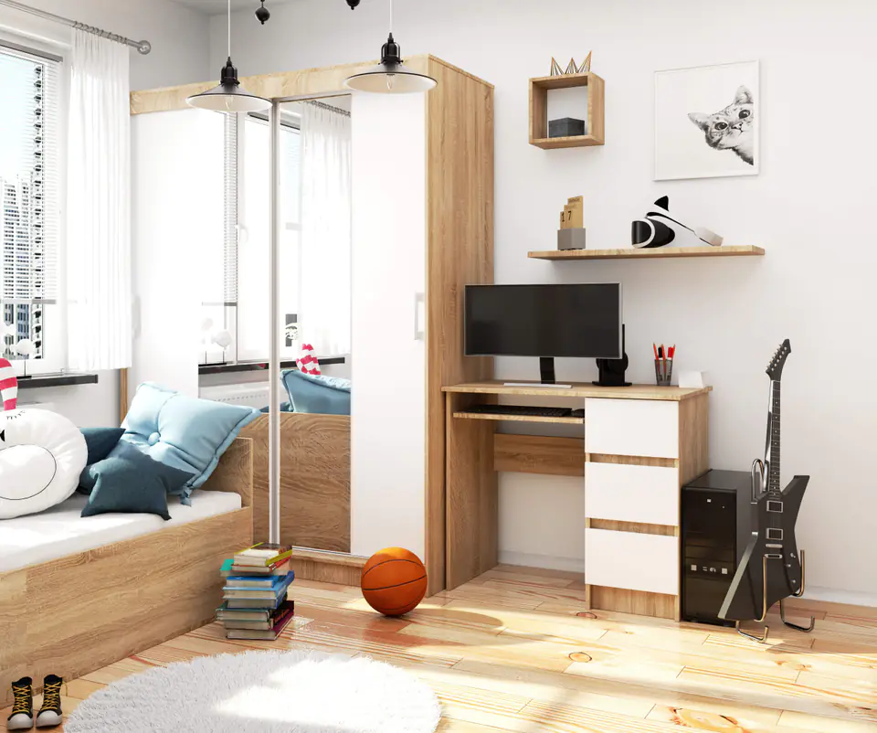 Biurko to mebel, którego nie może zabraknąć w żadnym pokoju dziennym oraz młodzieżowym. Jest praktyczne, zajmuje niewiele miejsca, a może służyć zarówno do pracy lub nauki, jak i rozrywki. Doskonale sprawdza się również w domowych gabinetach, a także przestrzeni biurowej. Wśród przygotowanego przez nas asortymentu mogą Państwo znaleźć wiele interesujących biurek zaprojektowanych w funkcjonalny i nowoczesny sposób. Jedną z propozycji jest biurko komputerowe A-6 (prawe), które sprosta oczekiwaniom nawet najbardziej wymagających klientów. To produkt wysokiej jakości, który wykazuje dużą odporność na uszkodzenia oraz ewentualne zarysowania. Dzięki temu może być stosowany w pomieszczeniach o dużym natężeniu ruchu. Na biurko składają się trzy niezwykle pojemne szuflady, a także wysuwana na prowadnicach rolkowych półka. Całość została utrzymana w dwóch modnych i ponadczasowych kolorach, do których należy dąb sonoma i biel.