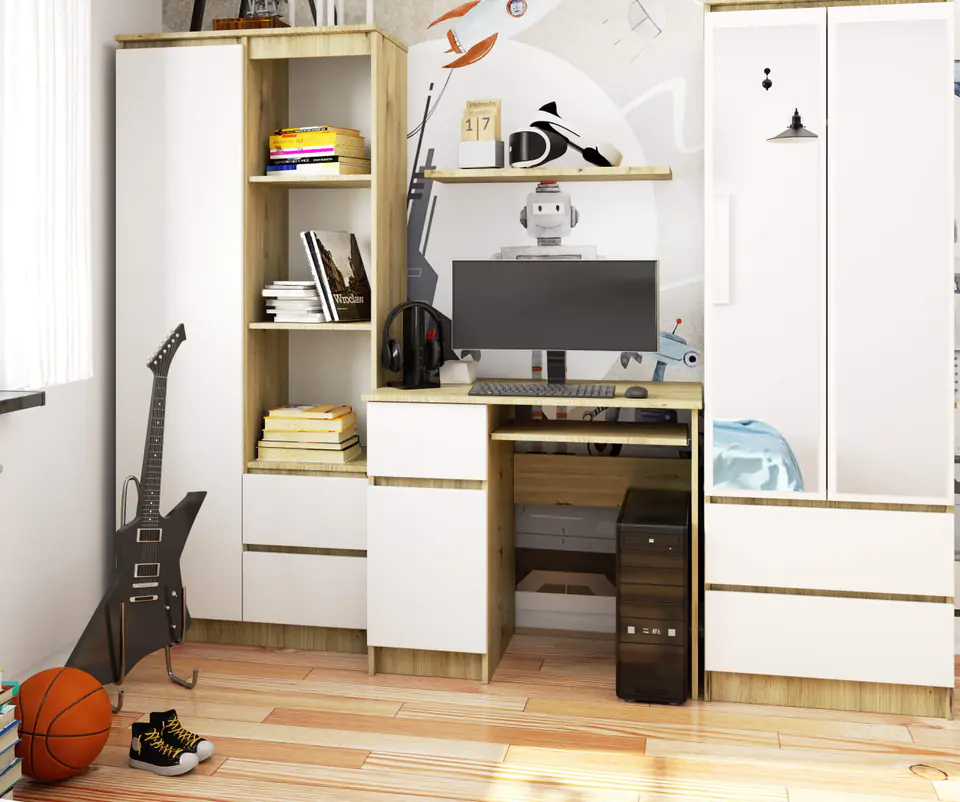 Biurko komputerowe PIKSEL dąb artisan/białe świetnie nadaje się do zastosowania w pokoju dziecięcym, młodzieżowym, czy też w sypialni albo salonie, w którym wydzielony został kąt do pracy zdalnej czy nauki. Sprawdzi się także w niewielkich pomieszczeniach biurowych, doskonale współgrając z innymi meblami w systemie bezuchwytowym.