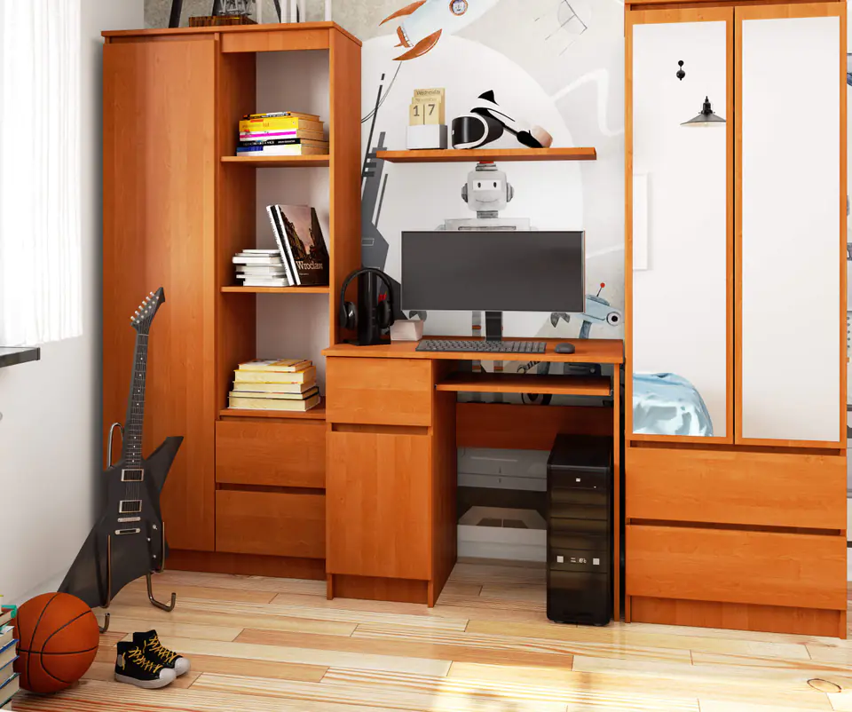 - Biurko wykonane z płyty laminowanej odpornej na ścieranie- Posiada wiele przestrzeni do dowolnego zagospodarowania- Front szuflady wykonany z płyty laminowanej- Szuflada i półka pod klawiaturę poruszają się na metalowych prowadnicach rolkowych- Widoczne krawędzie oklejone obrzeżem ABS gwarantujący wyższą odporność na uszkodzenia- Wewnątrz drzwiczek znajduje się jedna półka- Biurko do samodzielnego montażu- Instrukcja w dostawie- Gwarancja 24 miesiące
