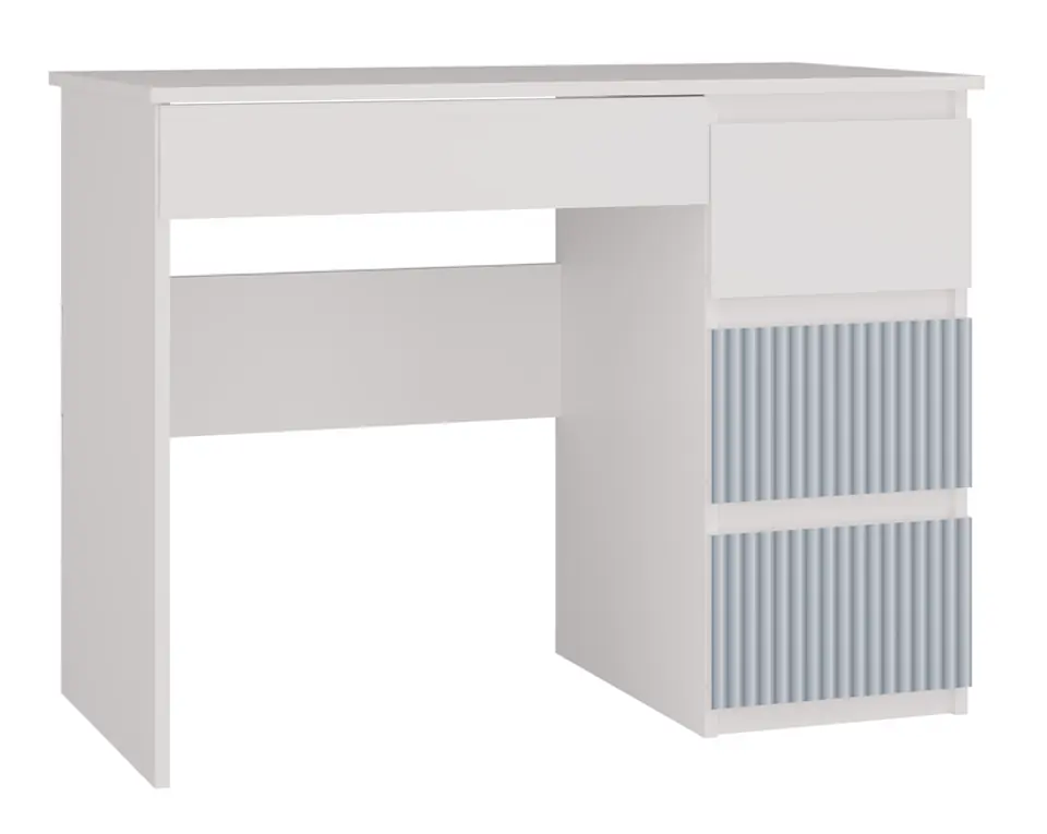- 3 pojemne wysokie szuflady z prawej strony (w tym 2 szuflady z niebieskimi wzorami) i 1 niska z lewej strony pod blatem