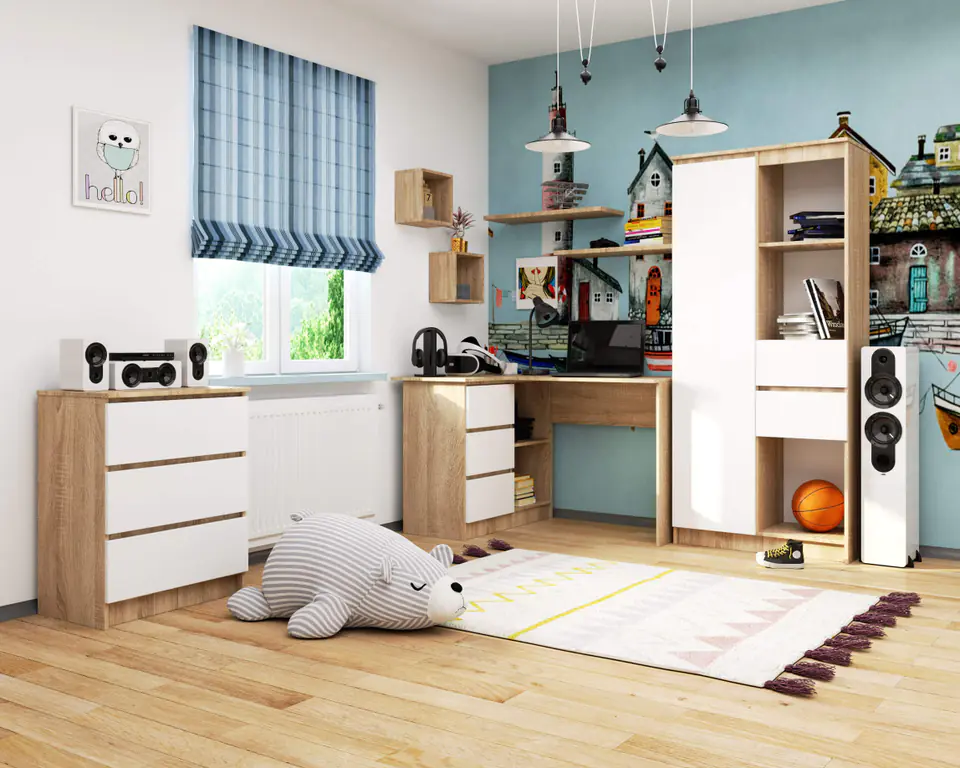 Biurko narożne wyposażone w trzy szuflady to ciekawa propozycja skierowana do osób preferujących nowocześnie urządzone wnętrza biurowe. To subtelne połączenie klasycznej bieli oraz bardzo modnego koloru, jakim jest dąb sonoma. Mebel składa się z biurka, dwóch otwartych szafek oraz szuflad. Prezentowana propozycja dobrze sprawdzi się w każdym pomieszczeniu biurowym, w którym ważne jest jak najbardziej funkcjonalne zagospodarowanie przestrzeni. Do produkcji wykorzystano płytę laminowaną grubości 16 milimetrów - wytrzymały materiał wykazujący dużą odporność na uszkodzenia. Biurko komputerowe narożne na pewno usatysfakcjonuje nawet najbardziej wymagających klientów, dla których ludzi się zarówno wygląd, jak i jakość oraz funkcjonalność. Zapraszamy również do poznania innych mebli pochodzących z tej samej kolekcji - komód, regałów oraz szaf, które są dostępne w tej samej kolorystyce. Dzięki nim z pewnością uda się stworzyć odpowiednią przestrzeń do pracy biurowej bądź nauki - zarówno w domu, jak i w biurze.