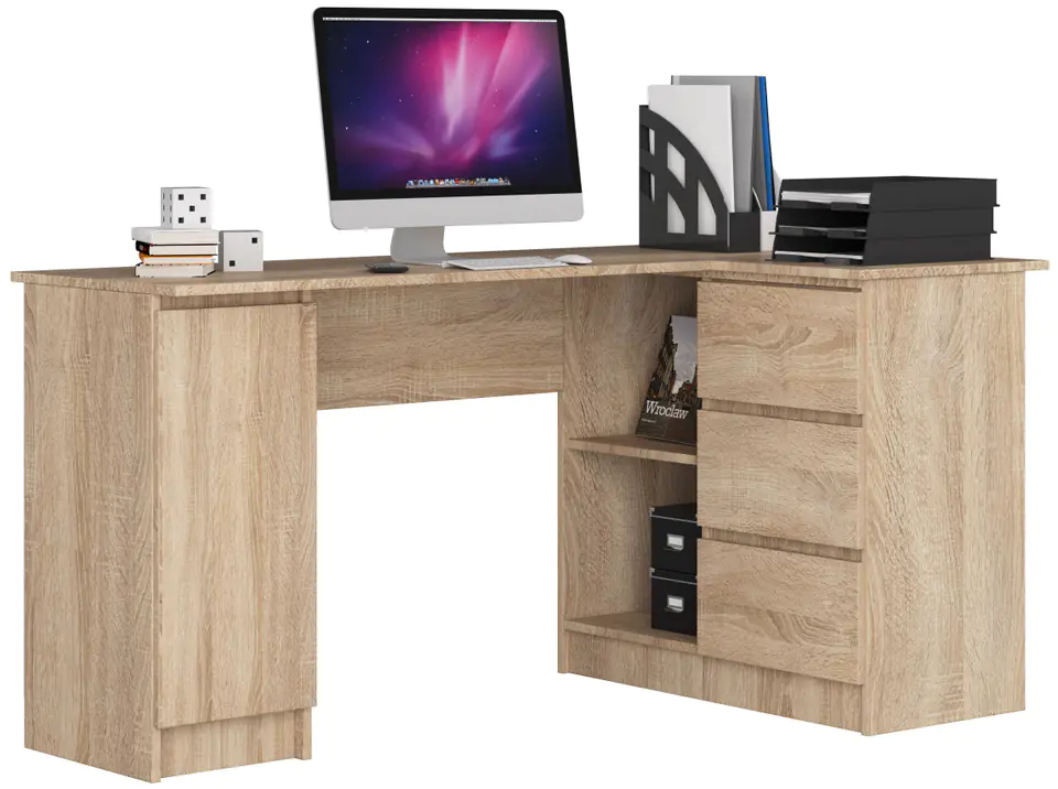 Biurko narożne to interesująca propozycja dedykowana osobom urządzającym biuro w stylu klasycznym. Proponujemy Państwu mebel o wysokiej funkcjonalności, który wyróżnia się również bardzo dobrą jakością. Trwałe i wytrzymałe biurko narożne jest również odporne na uszkodzenia, dzięki zastosowaniu wysokogatunkowej płyty meblowej. Kolor dąb sonoma będzie odpowiedni dla osób, które pragną stawiać na ponadczasową klasykę. Prezentowana przez nas propozycja świetnie sprawdzi się zarówno w domowych gabinetach, jak i przestrzeni biurowej.