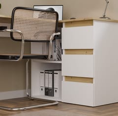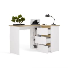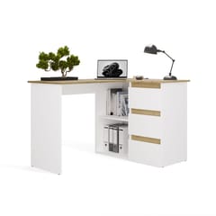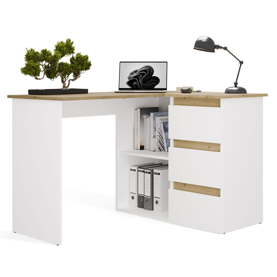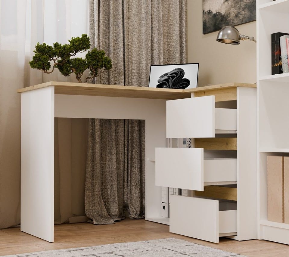 Biurko wyposażono w pojemne szuflady oraz otwarte półki, które ułatwiają organizację dokumentów i akcesoriów. Duży blat roboczy daje komfortową przestrzeń na komputer i codzienne zadania, a narożna konstrukcja pozwala maksymalnie wykorzystać dostępne miejsce.