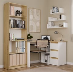MATERIAŁ: Korpus i fronty - płyta wiórowa laminowana 16 mm WYMIARY BIURKA: Głębokość: 48,5 cm Szerokość: 120 cm Wysokość: 75 cm WYMIARY REGAŁU: Głębokość: 38 cm Szerokość: 89 cm Wysokość: 75 cm W opakowaniu: Instrukcja montażu wraz ze wszystkimi potrzebnymi akcesoriami montażowymi. Użytkowanie: Powierzchnię mebla czyścić przy pomocy miękkiej szmatki. Unikać stosowania silnie działających środków chemicznych. Meble są fabrycznie zapakowane do samodzielnego montażu. Informacja: Dokładamy wszelkich starań, aby kolory mebli prezentowane na zdjęciach były odwzorowane możliwie jak najdokładniej. Należy jednak pamiętać, że ich odbiór może się różnić w zależności od indywidualnych ustawień monitora lub ekranu (takich jak jasność, kontrast, temperatura barwowa czy technologia wyświetlania). Rzeczywisty odcień produktu może się także różnić w zależności od warunków oświetleniowych. Ewentualne różnice kolorystyczne nie wynikają z wady produktu.