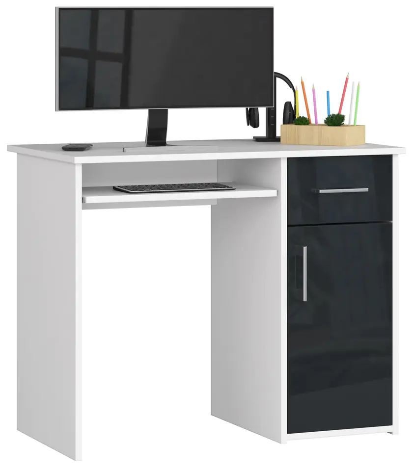 - Biurko wykonane z płyty laminowanej odpornej na ścieranie - Posiada wiele przestrzeni do dowolnego zagospodarowania- Wewnątrz drzwiczek znajduje się jedna półka- Fronty szuflad i drzwiczek wykonane z płyty MDF AKRYL Wysoki Połysk- Szuflady i półka pod klawiaturę poruszają się na metalowych prowadnicach rolkowych- Widoczne krawędzie oklejone obrzeżem ABS gwarantujący wyższą odporność na uszkodzenia- Uchwyty do szuflad i drzwiczek koloru srebrnego- Biurko do samodzielnego montażu - Biurko wolnostojące (płyta laminowana z tyłu biureczka)- Instrukcja w dostawie - Gwarancja 24 miesiące