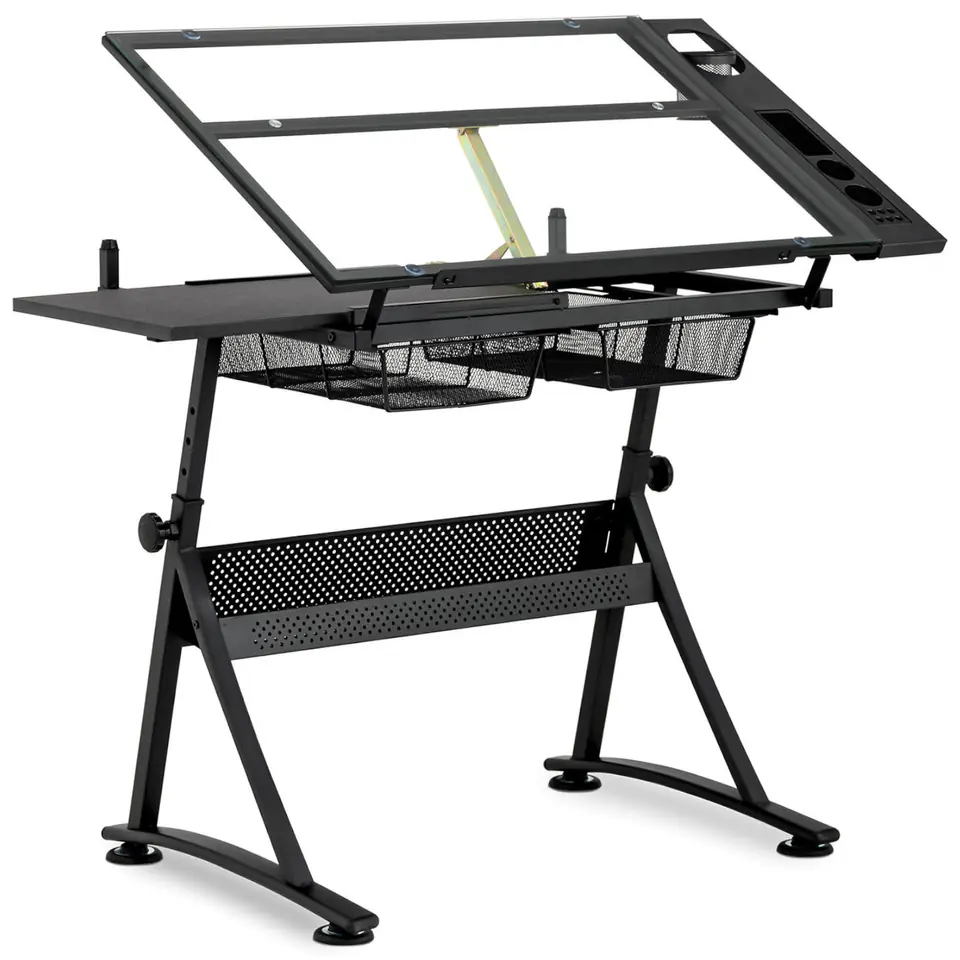 Kod producenta: 10260095Biurko kreślarskie marki Fromm Starck to niezastąpione elementy wyposażenia pracowni artystycznej lub biura architekta. Duża powierzchnia robocza o wymiarach 120 x 60 cm sprawia, że bezproblemowo rozłożysz całe arkusze papieru. Dodatkowo blat możesz ustawić pod kątem w zakresie 0-70deg;. Biurko kreślarskie posiada dwie pojemne szuflady, przybornik oraz metalową półkę. Górny blat wykonano ze szkła hartowanego o grubości 6 mm, a dolny z 15-milimetrowej płyty MDF. Ponadto niektóre elementy zrobiono z PVC. Do stworzenia ramy użyto stalowych rurek pomalowanych proszkowo. Biurko wyposażone zostało w gumowe nóżki chroniące przed ślizganiem się.Cechy produktu: