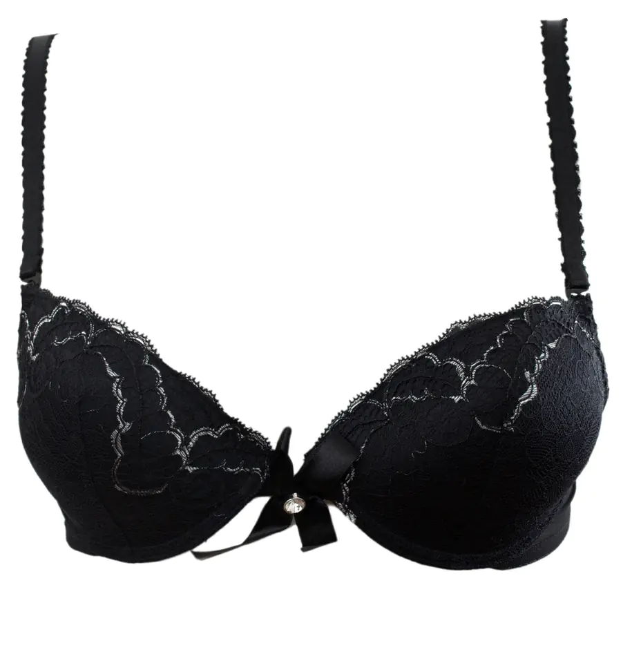Biustonosz usztywniany na fiszbinach. Odpowiednio wyprofilowane miseczki oraz wkładki push-up podtrzymują biust i ładnie eksponują dekolt, dając tym samym subtelny optyczny efekt powiększenia piersi. Miseczki pokryte piękną koronką.