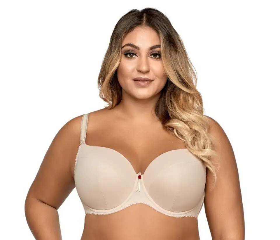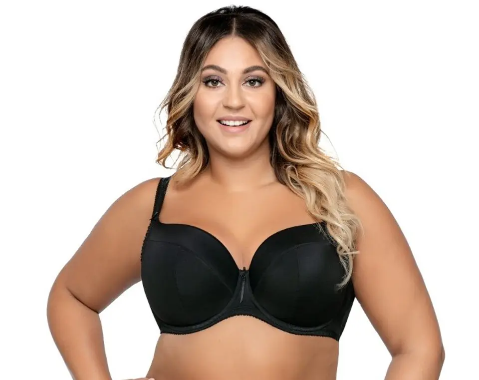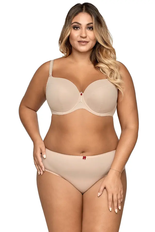 Klasyczny gładki full cup, który zachwyca doskonałą konstrukcją. Biustonosz z wysokim mostkiem w całości wykonany jest z delikatnej mirofibry, miękkiej pianki i przyjemnej bawełny. Pełne miseczki dokładnie okalają biust i unoszą, co pozwala uzyskać kuszący dekolt. Plecy dzięki elastycznej dzianinie z domieszką lycry doskonale dopasowują się do ciała i pozwalają utrzymać biustonosz w odpowiednim miejscu. Typ – full cup. Kolor – biały/beżowy/czarny. Konstrukcja – full cup painel (K-924). Ramiączka – nieodpinane/regulowane z metalowym, powlekanym regulatorem. Zapięcie – dwurzędowa/trzyrzędowa, dwustopniowa haftka, fiszbiny boczne.
