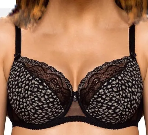 Piękny półusztywniany biustonosz. Dolna część miseczki pokryta jest wzorzystą dzianiną, górna zaś wykonana jest z subtelnej koronki. Biustonosz posiada regulowane, nieodpinane ramiączka. Skład: 88% poliamid, 8% bawełna, 4% elastan.