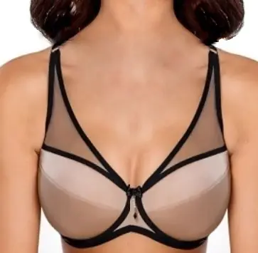 Biustonosz push-up z wyjmowanymi wkładkami. Miseczki uszyte z połyskującej mikrofibry, wykończone czarnymi lamówkami. W górnej linii delikatna tiulowa siateczka przechodząca w ramiączko. Boczki gładkie, ramiączka nieodpinane.