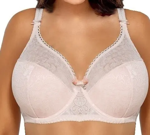 Śliczny, kobiecy biustonosz półusztywniany, uszyty z dzianiny pokrytej wzorzystym plenem. Miseczki zabudowane, w dolnej części usztywnione. Boczki wzmocnione pionową fiszbiną. Ramiączka nieodpinane. Idealny model dla Pań z większym, pełnym biustem.