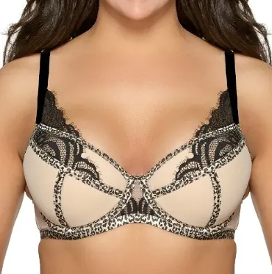 Biustonosz typu push-up, na fiszbinach, wyjmowane wkładki. Ozdobiony koronką i lamówkami w lampardzie cętki. Ramiączka nieodpinane, regulowane. Zapinany na dwie haftki z czterostopniową regulacją. Skład: 85% poliamid, 15% elastan.
