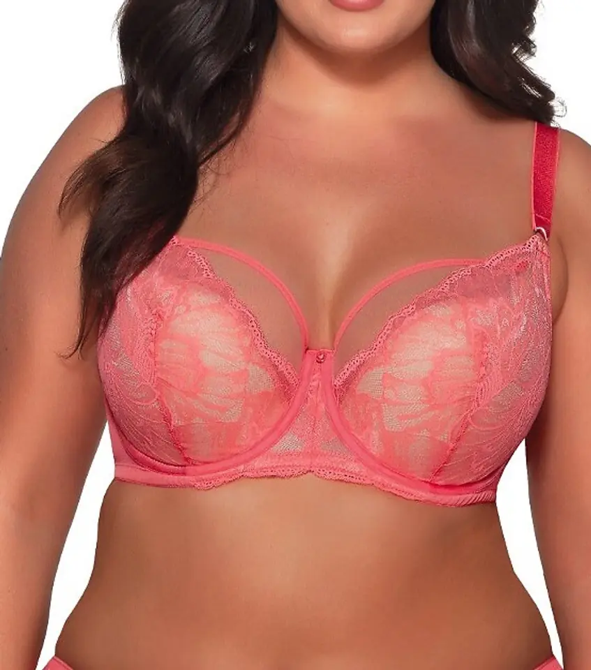 Biustonosz semi soft, miseczki z kwiatowej koronki w kolorze koralowym z fiszbinami. W górnej linii transparentna siateczka. Od wewnętrznej strony podszyte bawełną. Regulowane, nieodpinane ramiączka. Skład: 88% poliamid, 8% bawełna, 4% elastan.