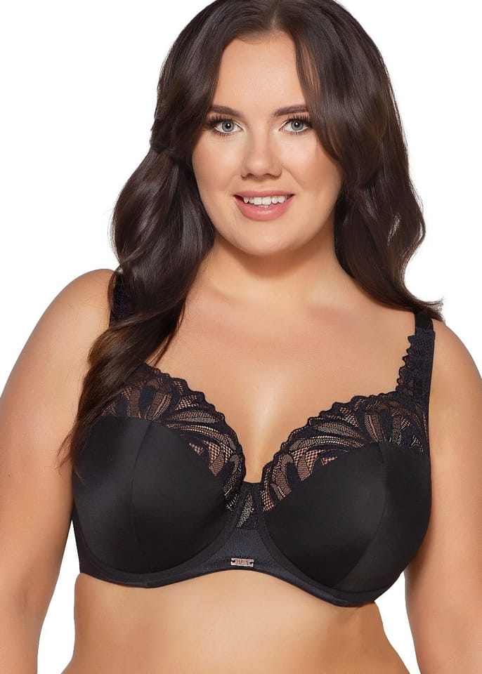 Biustonosz z półusztywnianymi miseczkami. Miseczki z siateczki i koronki, podszyte czarną bawełną. Górna linia z koronki. Z fiszbinami. Ramiączka nieodpinane, regulowane. Skład: 88% poliamid, 8% bawełna, 4% elastan.