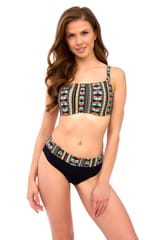 Kostium Gabriella został stworzony z myślą o miłośniczkach etnicznych wzorów. Model niezwykle efektowny, zdobiony wyrazistym, wielokolorowym wzorem geometrycznym, który nadaje całości charakter i oryginalność. Biustonosz przeznaczony dla Pań na duże i średnie biusty, w formie opaski. Ramiączka regulowane nieodpinane. Szerokość ramiączek i typ zapięcia dopasowany do rozmiaru kostiumu. Skład surowcowy: 85% Poliamid, 15% Elastan