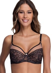 Elegancki biustonosz w konstrukcji soft z fiszbinami, doskonały na duże i średniej wielkości piersi. Model niemal w całości wykonano z pięknej koronki, którą na dekolcie zestawiono z siateczkowym tiulem. Konstrukcja bardzo dobrze zbiera i modeluje piersi dobrze utrzymując ich ciężar. Środek zdobiony luksusowo błyszczącą przywieszką. Skład: 88% poliamid, 8% bawełna, 4% elastan.