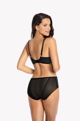 Biustonosz półusztywniany z miseczką wyciągniętą do ramiączka. Cała miseczka z dzianiny w paski. Plecy całe z lycry. Krój średnio zabudowany. Od wewnątrz wyścielony jest 100% bawełną. Skład: 62% Poliamid, 23% Bawełna, 9% Elastan, 6% Poliuretan.